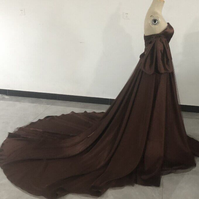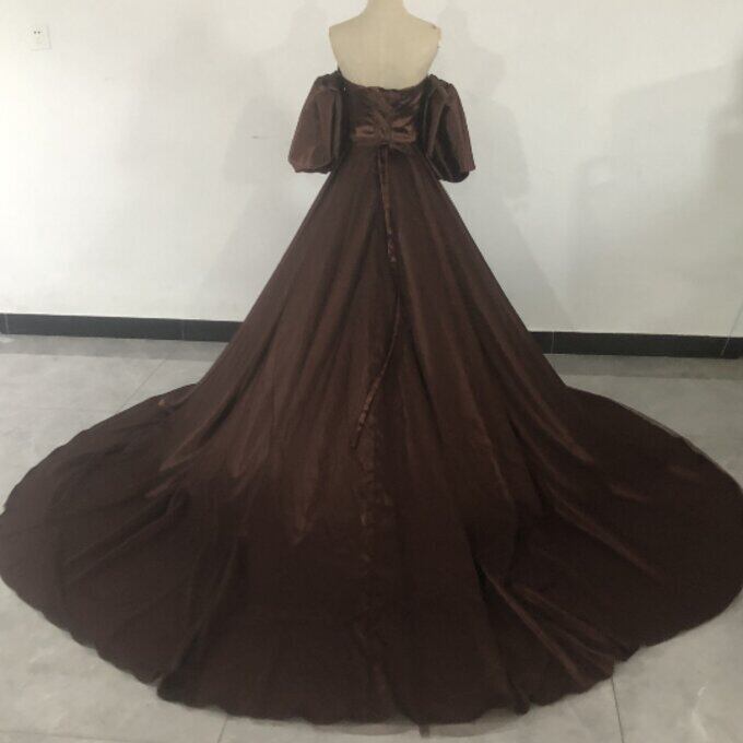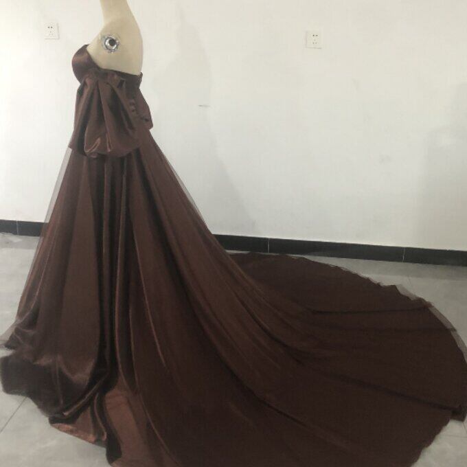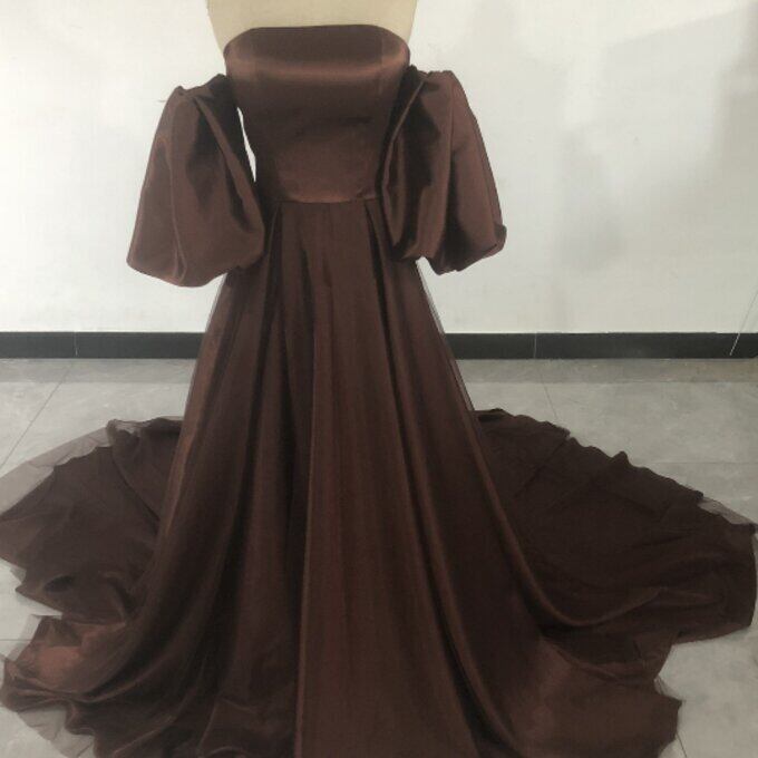 ブラウンカラードレス ベアトップ パフスリーブ トレーン 姫袖 二次会