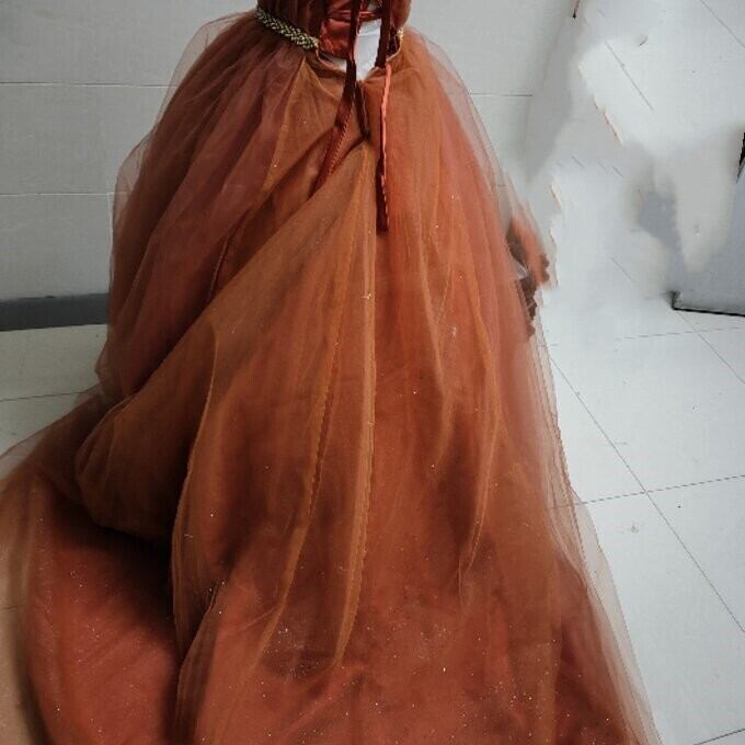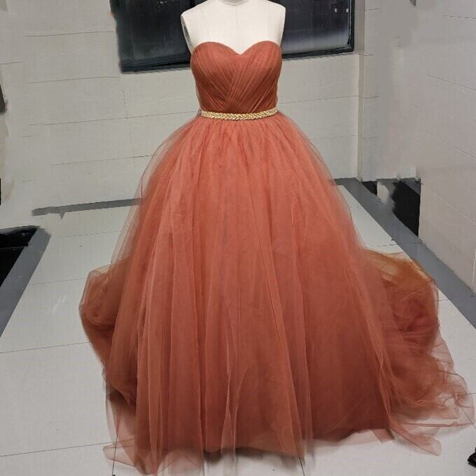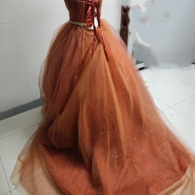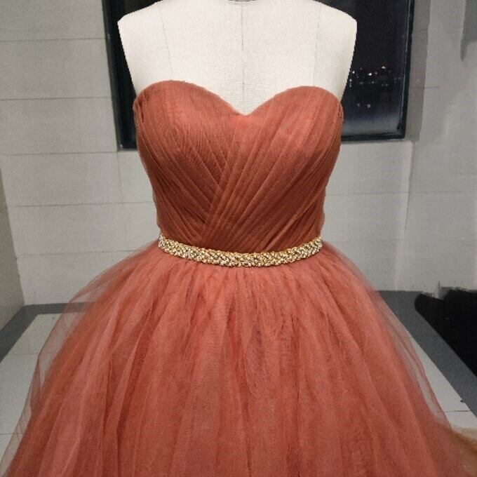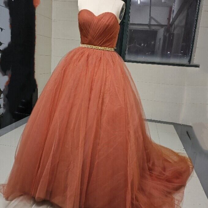 高品質!テラコッタ色 カラードレス ベアトップ トレーン パーティードレス 編み上げ 花嫁/披露宴