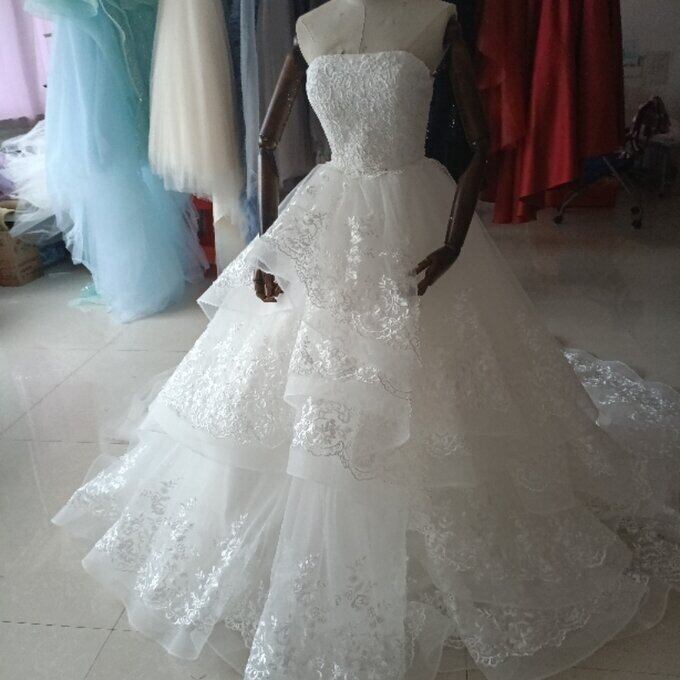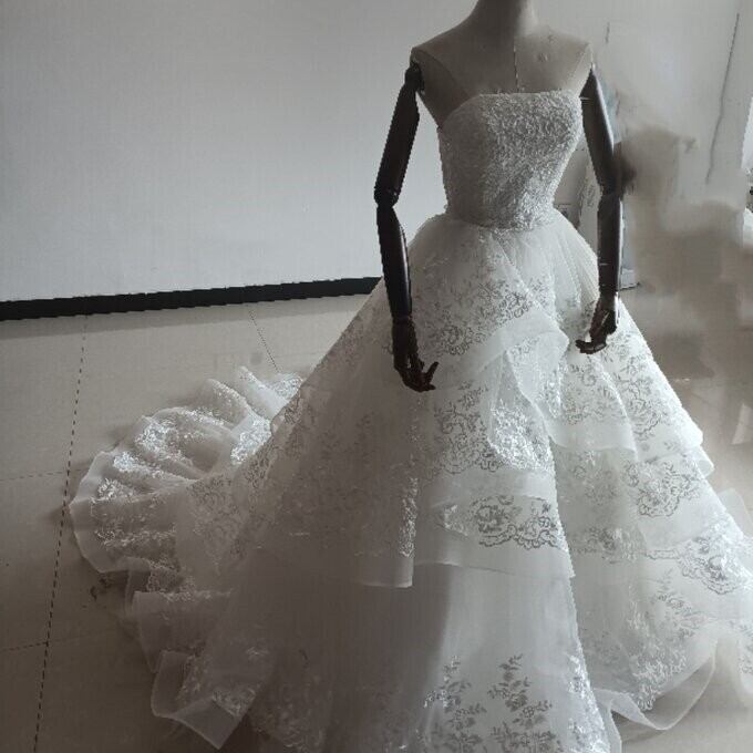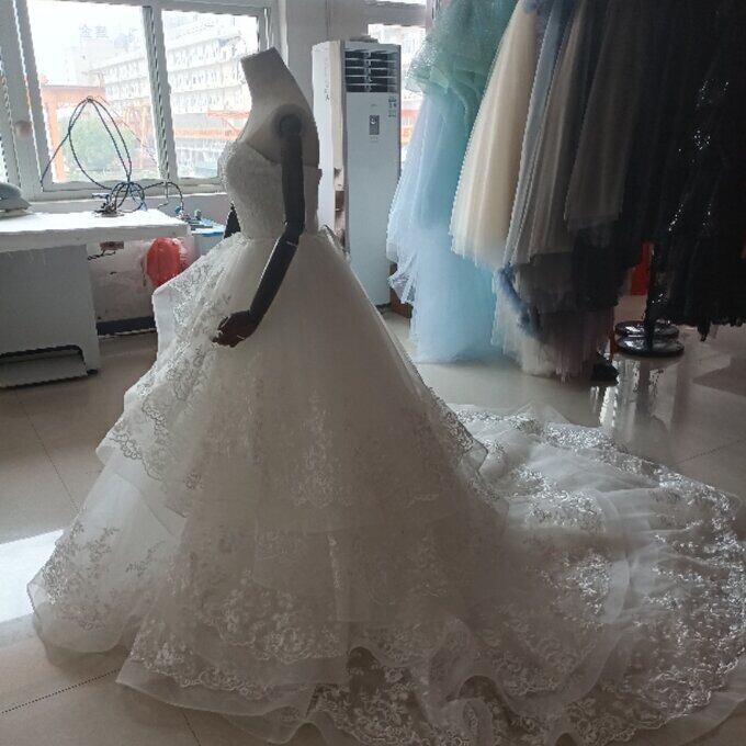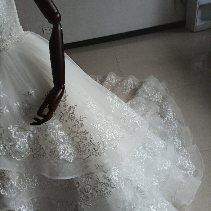 豪華!オフホワイト ウエディングドレス 華やかなトレーン 繊細レース 結婚式/披露宴