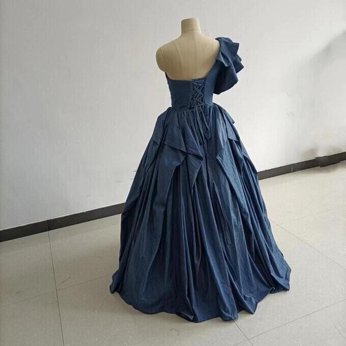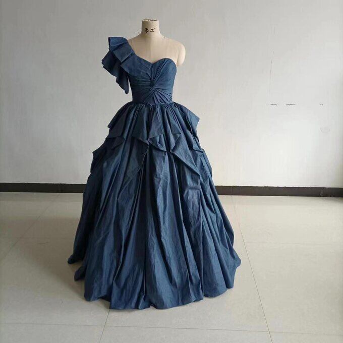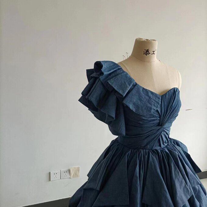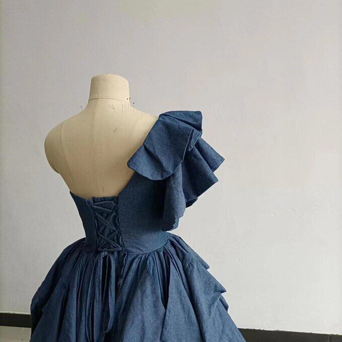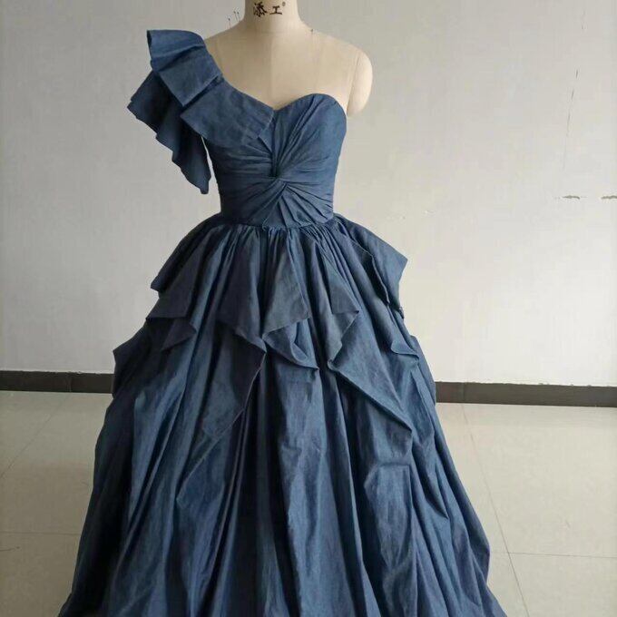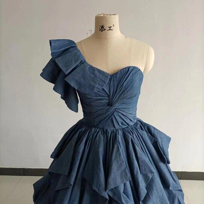 高品質!ブルーグレー デニムドレス ベアトップ 取り外し袖 披露宴/二次会