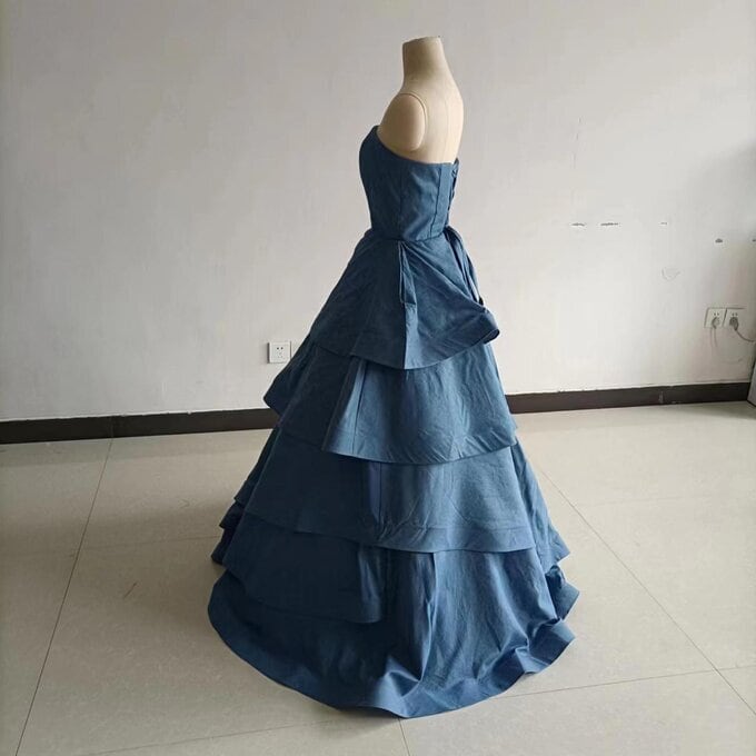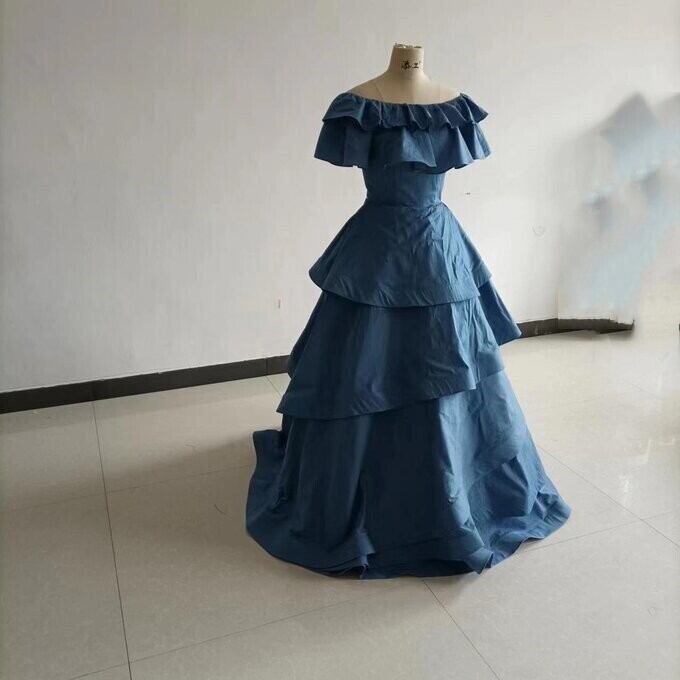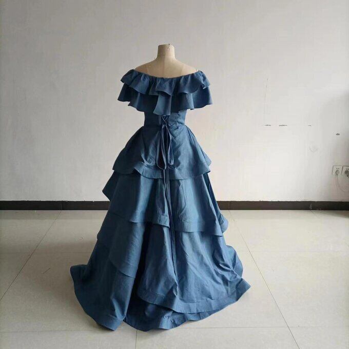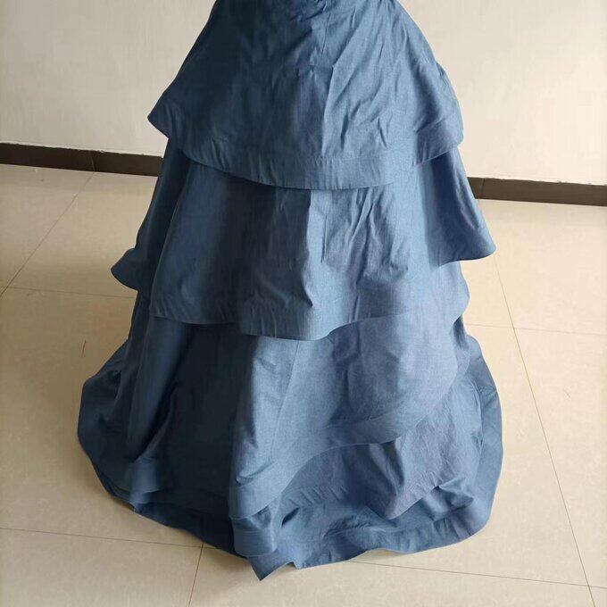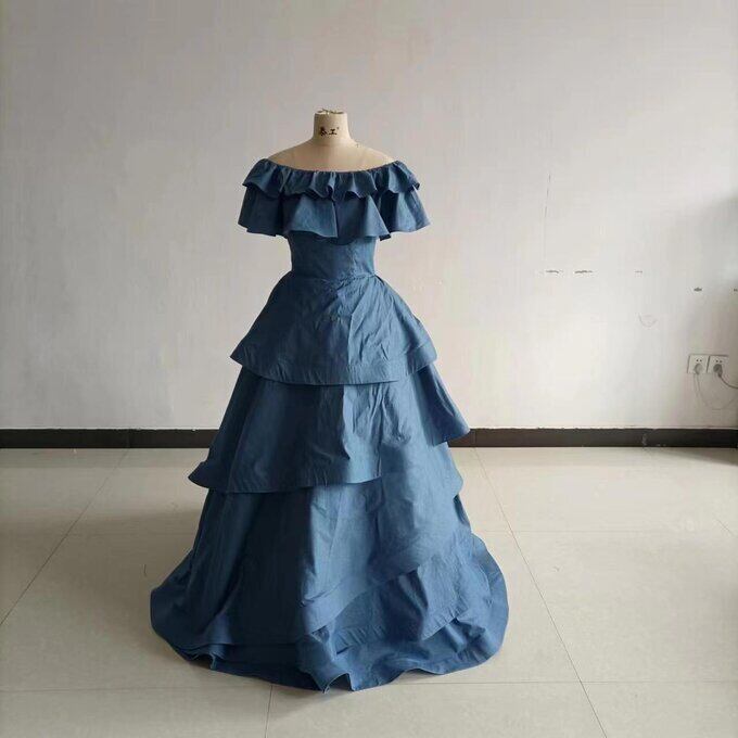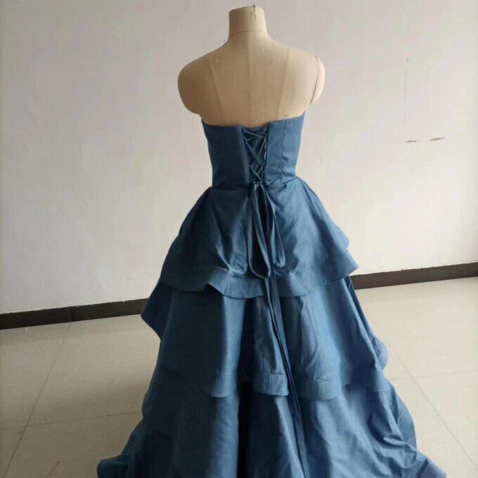 送料無料!ブルーグレー デニムドレス 取り外しオフショルダー ロング プリーツスカート 二次会/拳式