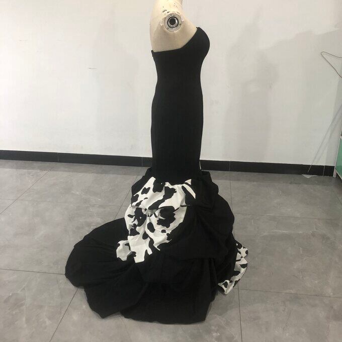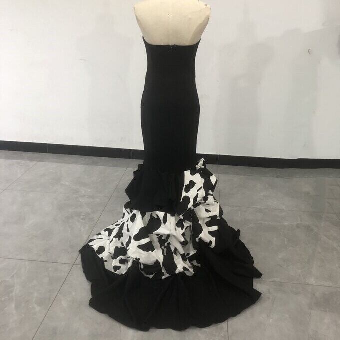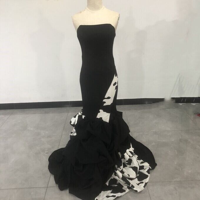 ダルメシアン柄黒ドレス マーメイド ベアトップ 披露宴/拳式 クシュクシュ