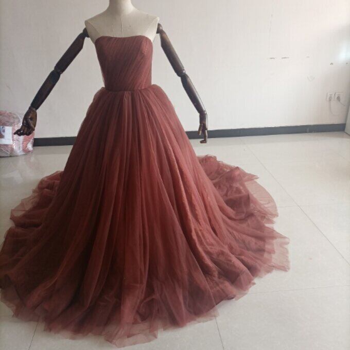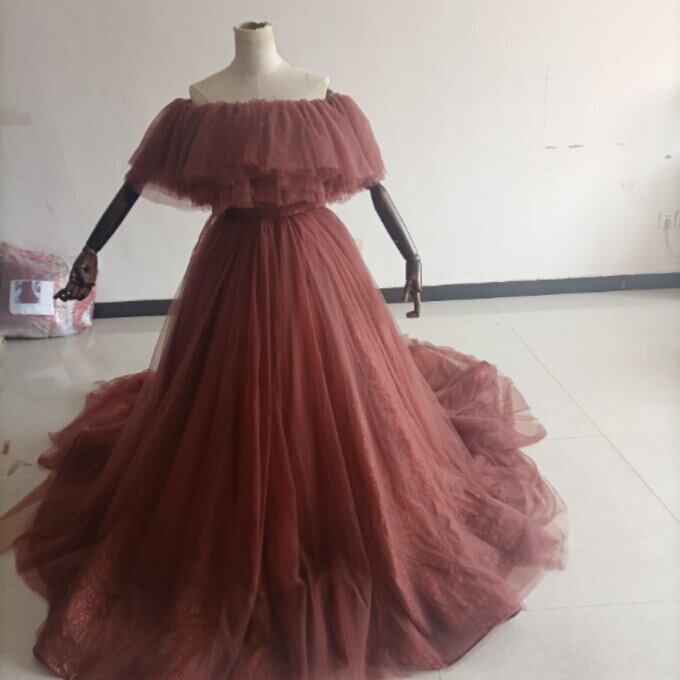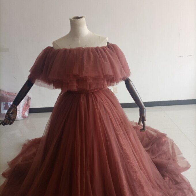 柔らかく重ねたチュールスカートドレス テラコッタ色 オフショル 二次会