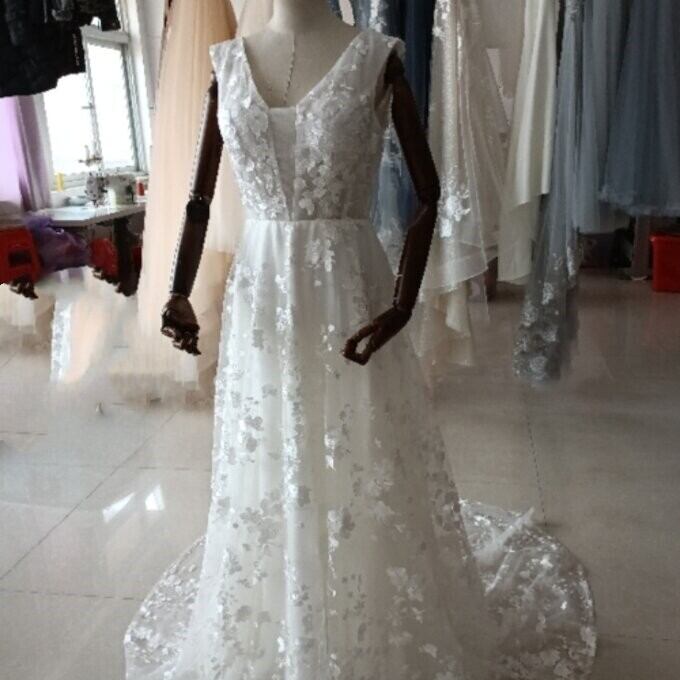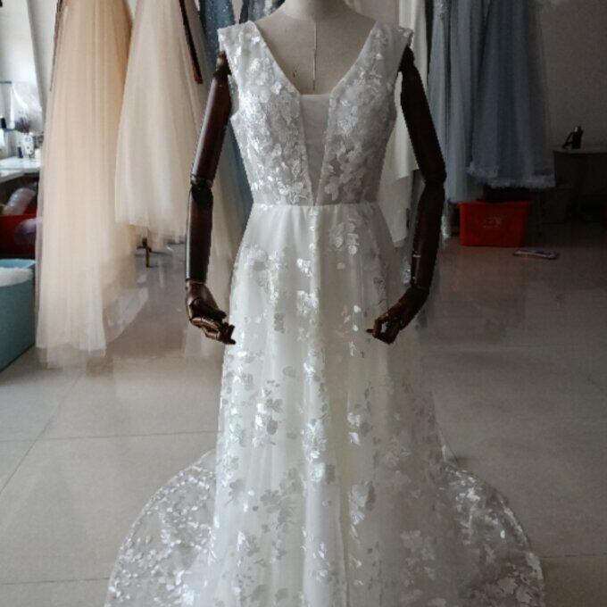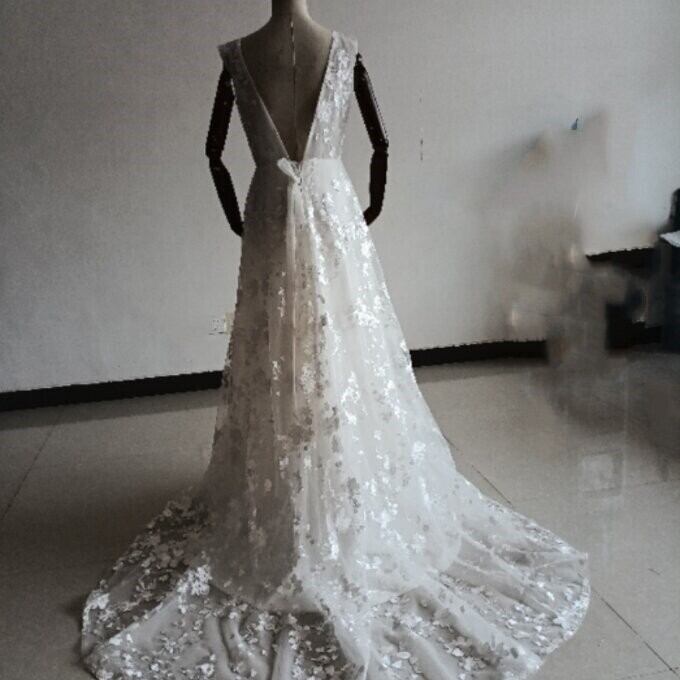 上品!オフホワイト Vネックドレス 総レース クラシカル 憧れのドレス 華やかなトレーン 結婚式/披露宴/二次会