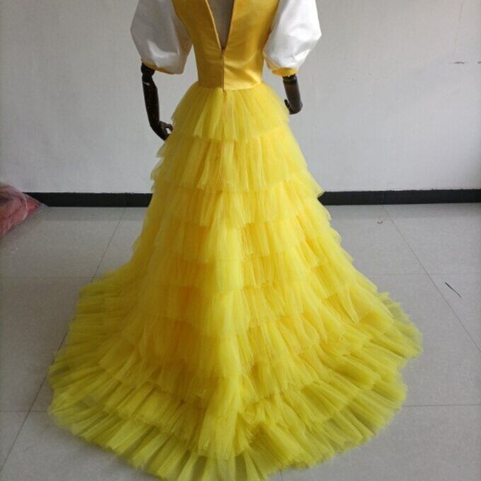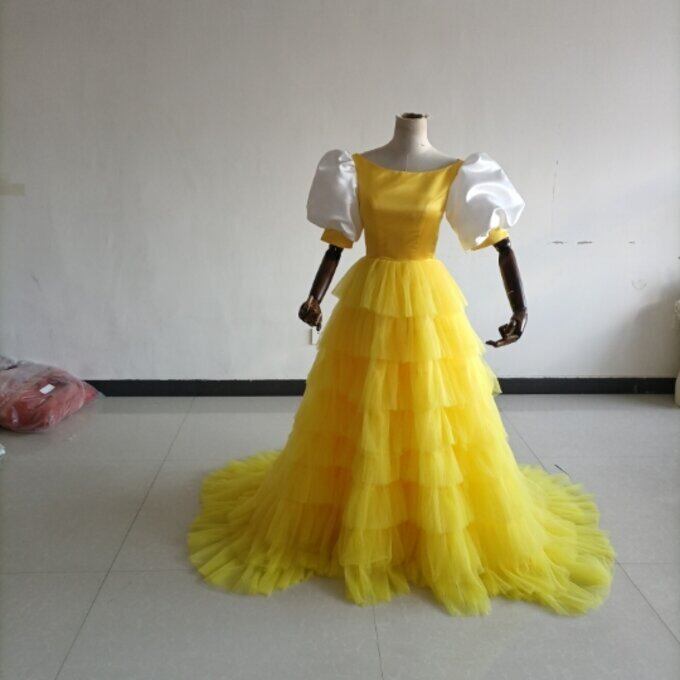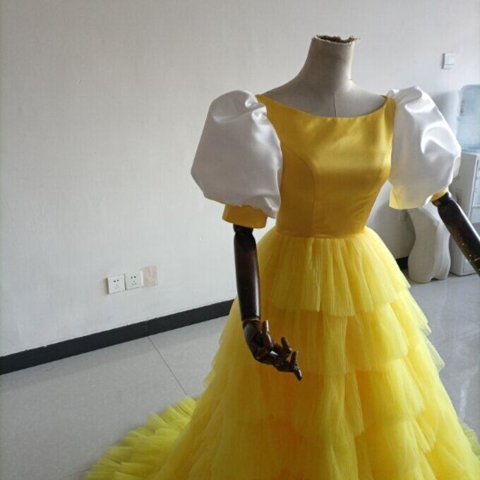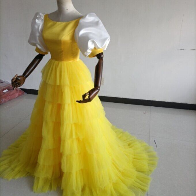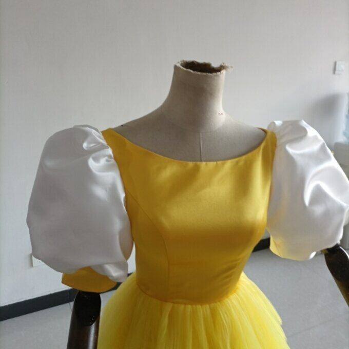 送料無料!華やか スパンカラードレス 短袖 イエロー クルーネック 柔らかく重ねたチュールスカ