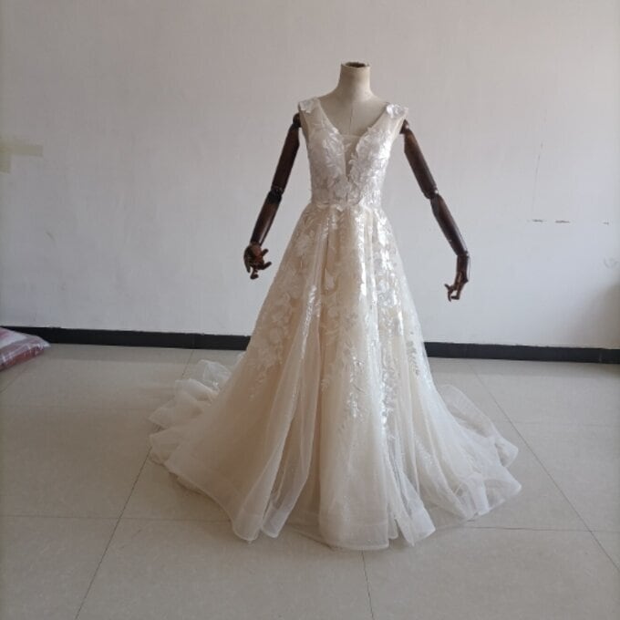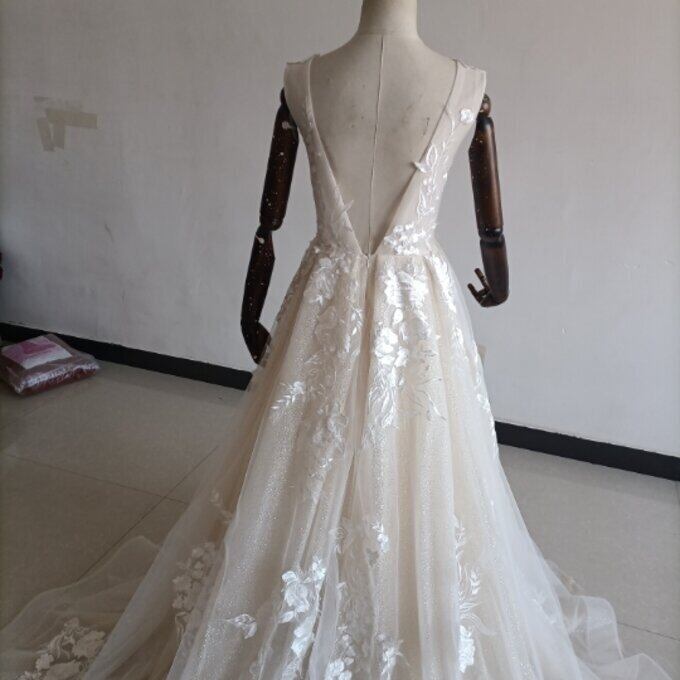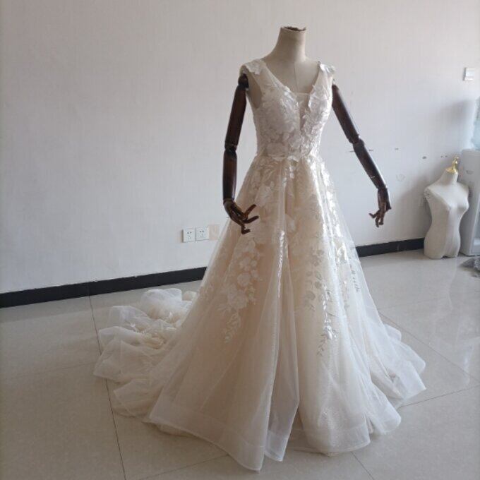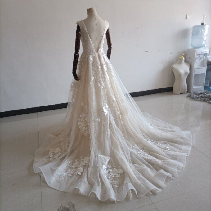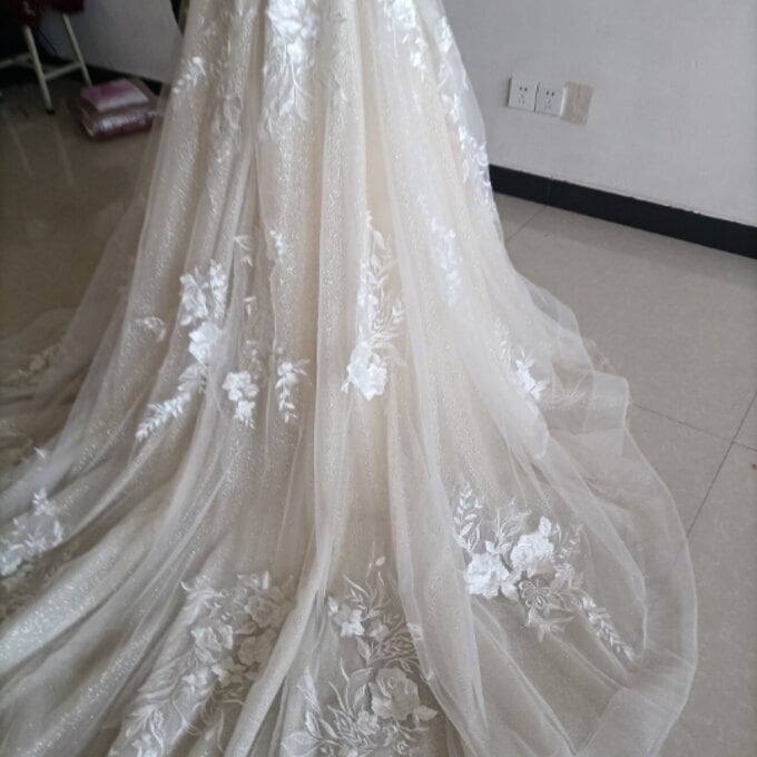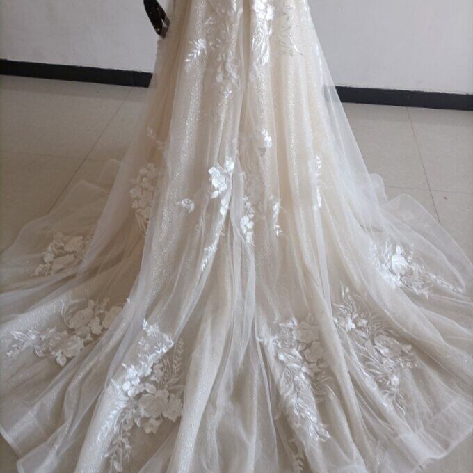 即納!ウエディングドレス ファスナー キラキラチュール エレガント レース 背中見せ トレーン 花嫁 結婚式