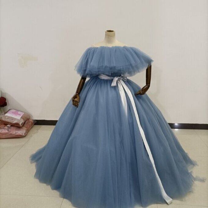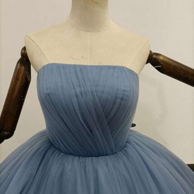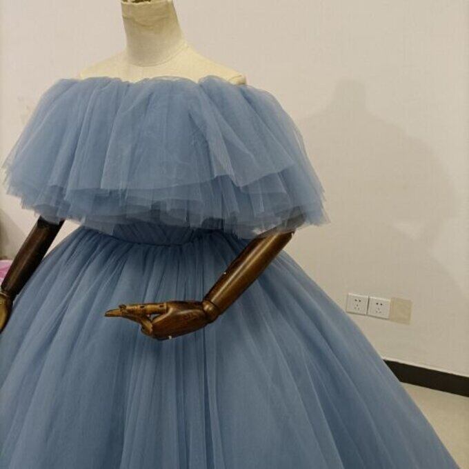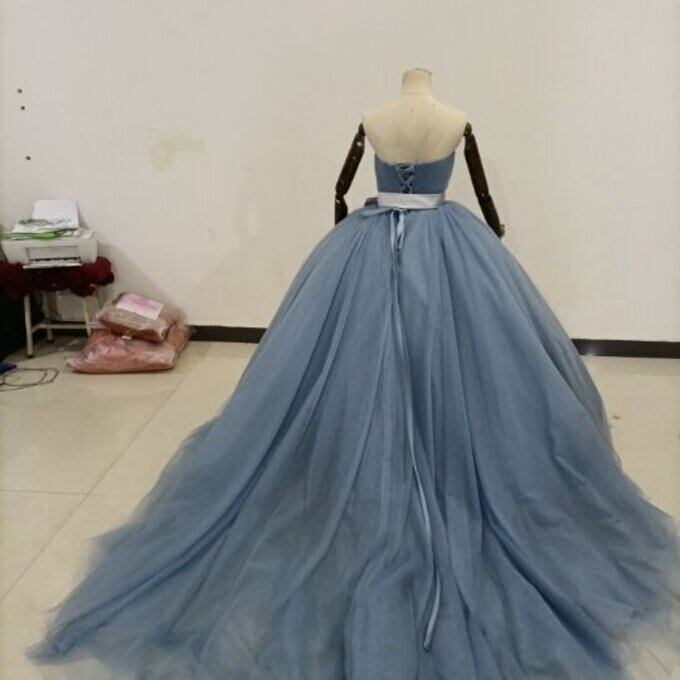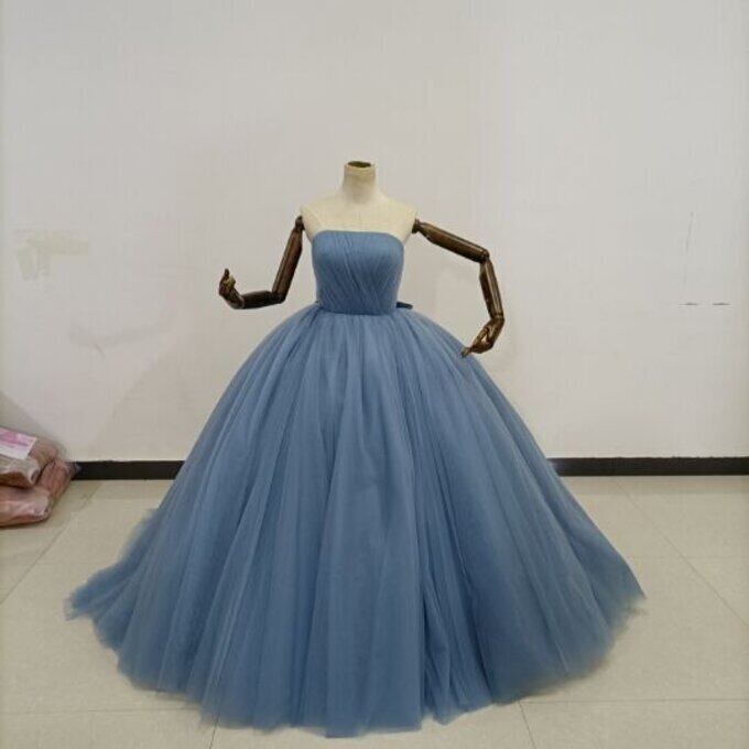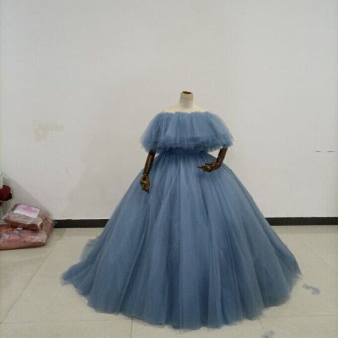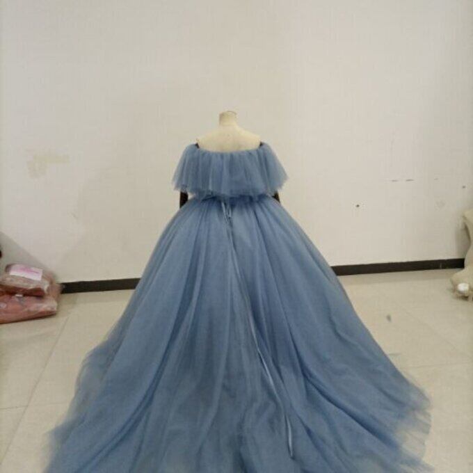 送料無料!ダスティーブルーカラードレス ボリュームチュールケープ ウエディングドレス