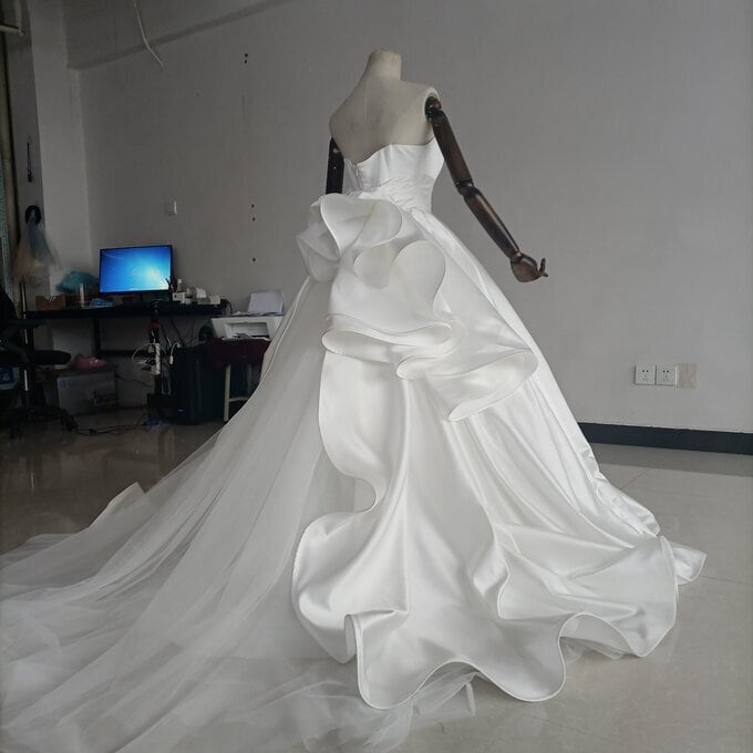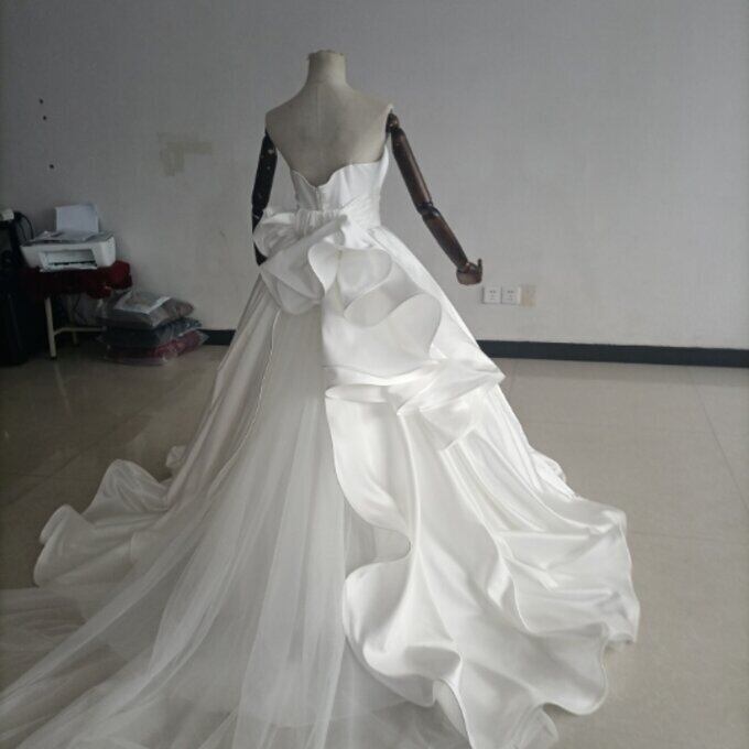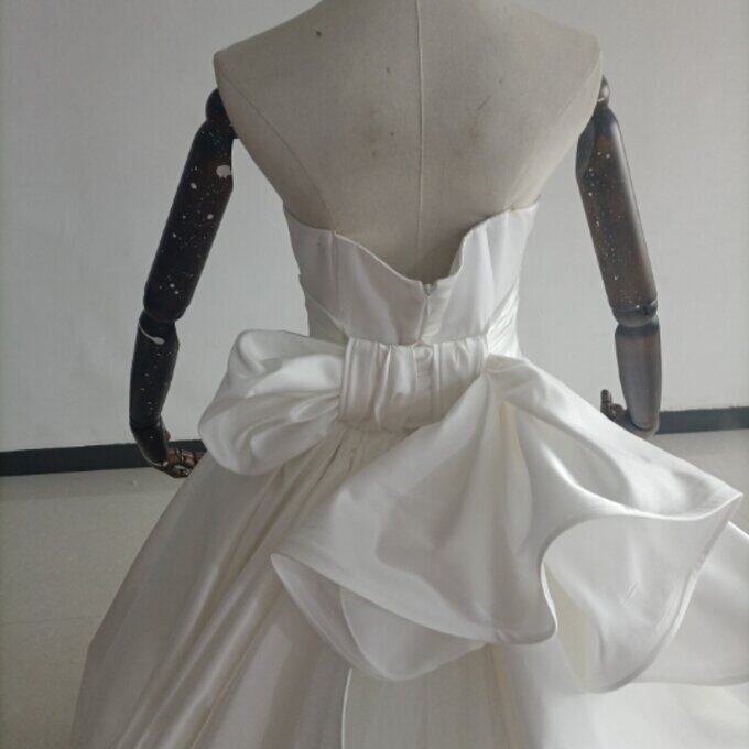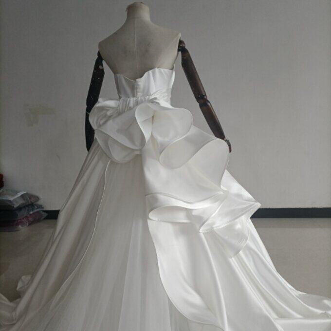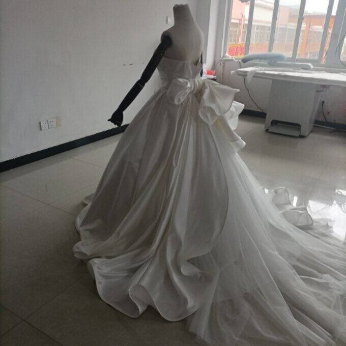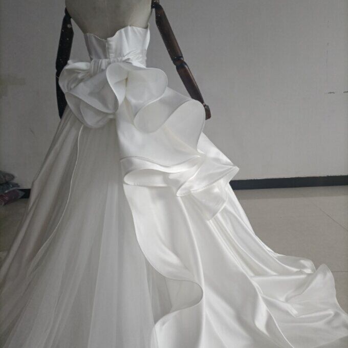 即納!豪華!オフホワイト ドレス Aライン ベアトップ サッシュベルト 華やかなトレーン 結婚式/披露宴/二次会