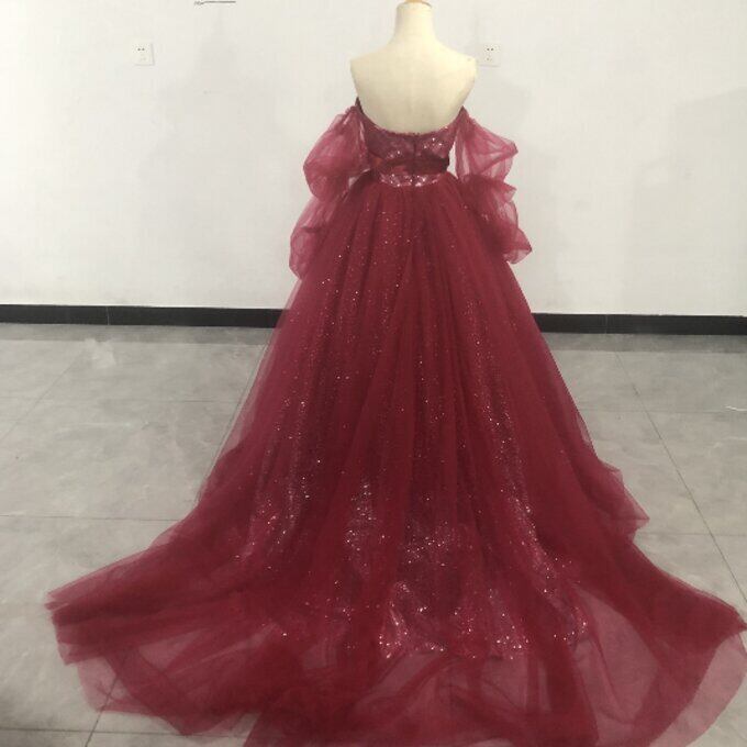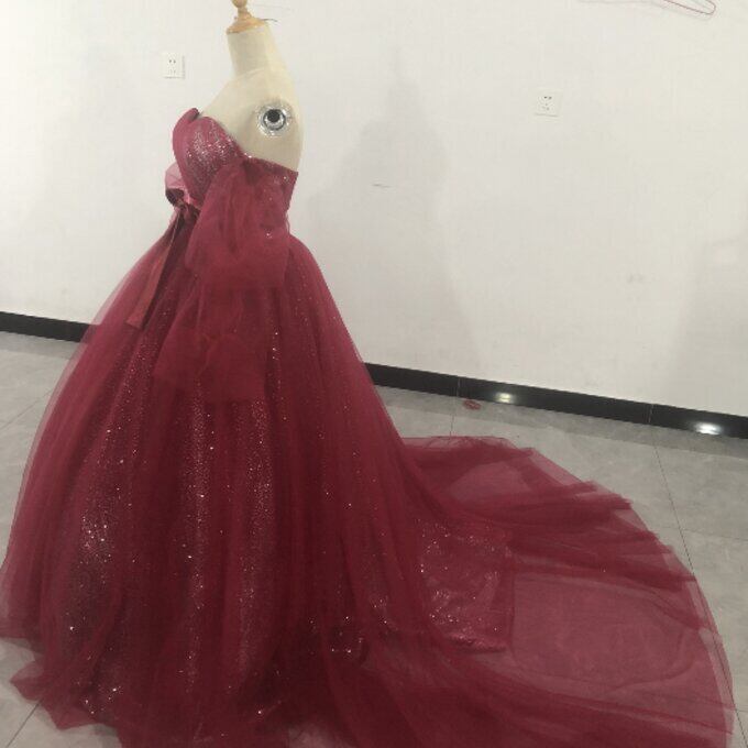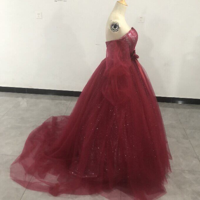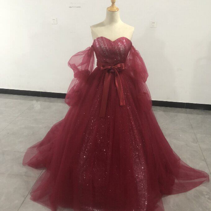 即納!憧れのドレス ワインレッド カラードレス キラキラ ベアトップ 取り外し袖 花嫁/披露宴