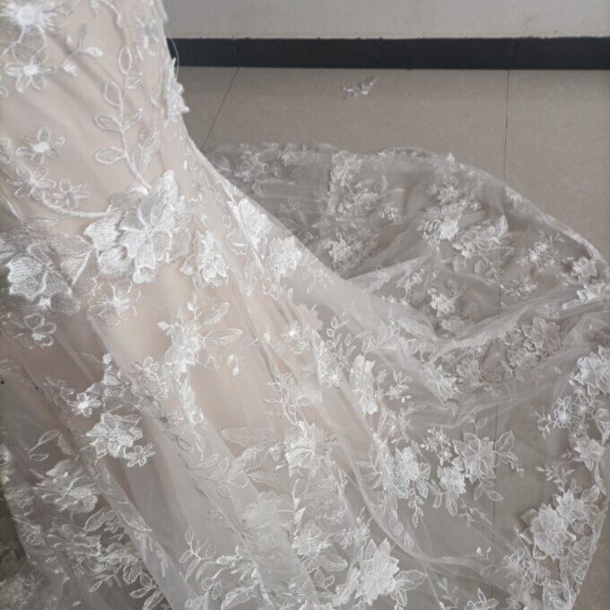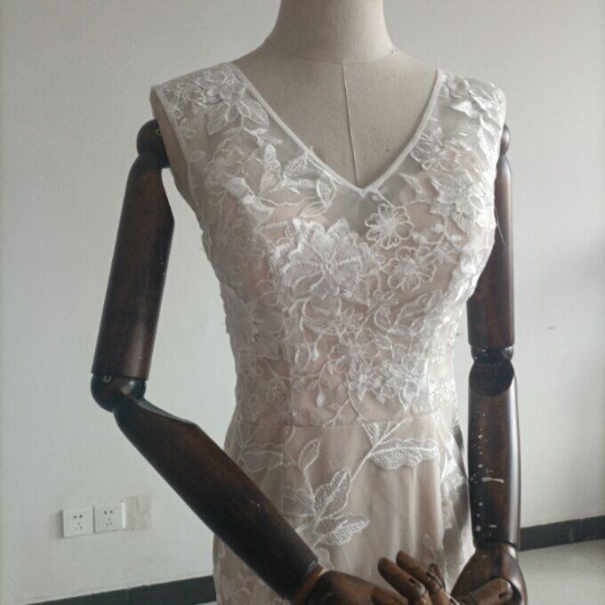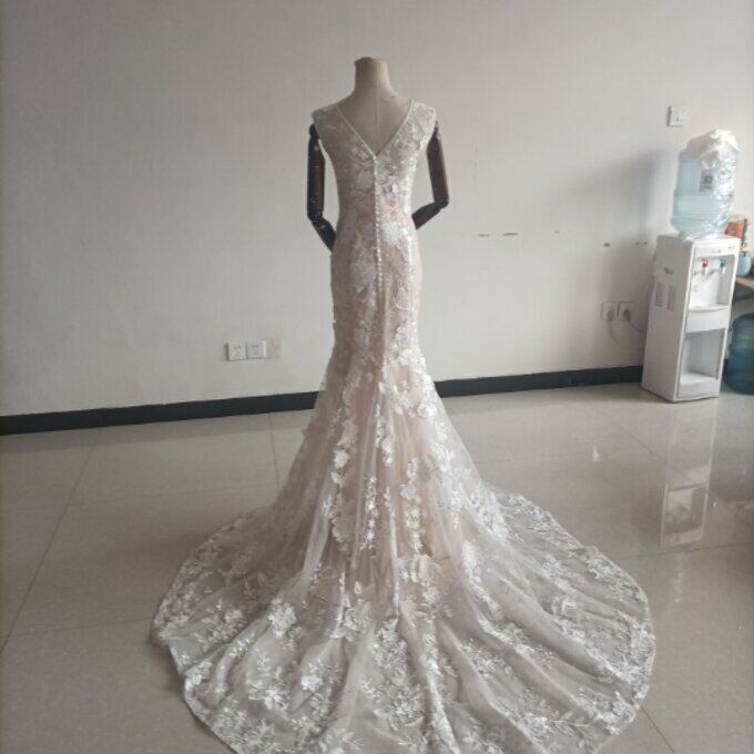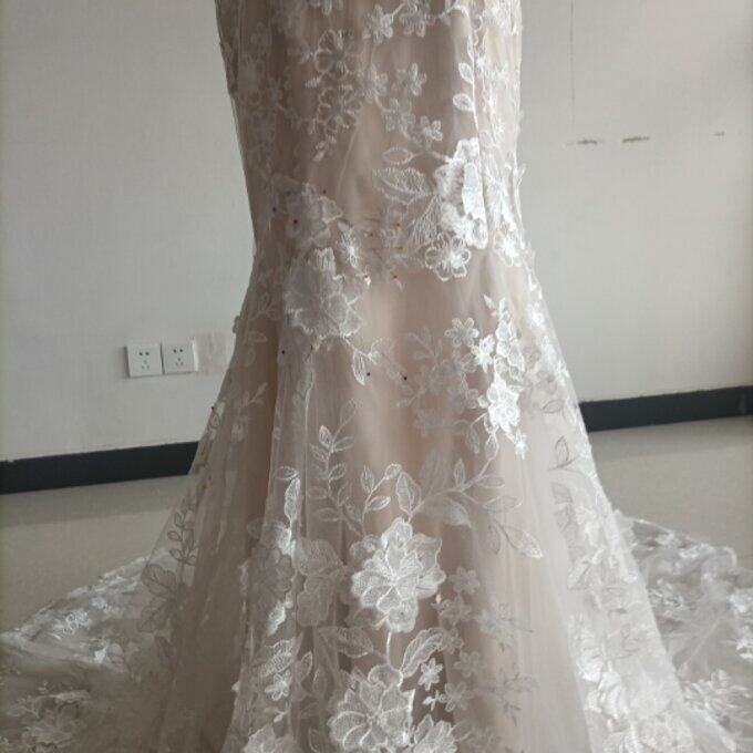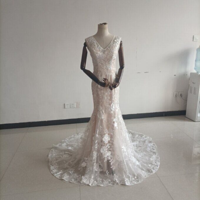 憧れのドレス 薄シャンパンの色 Vネックドレス マーメイドライン 繊細レース 結婚式/披露宴/二次会