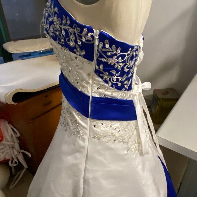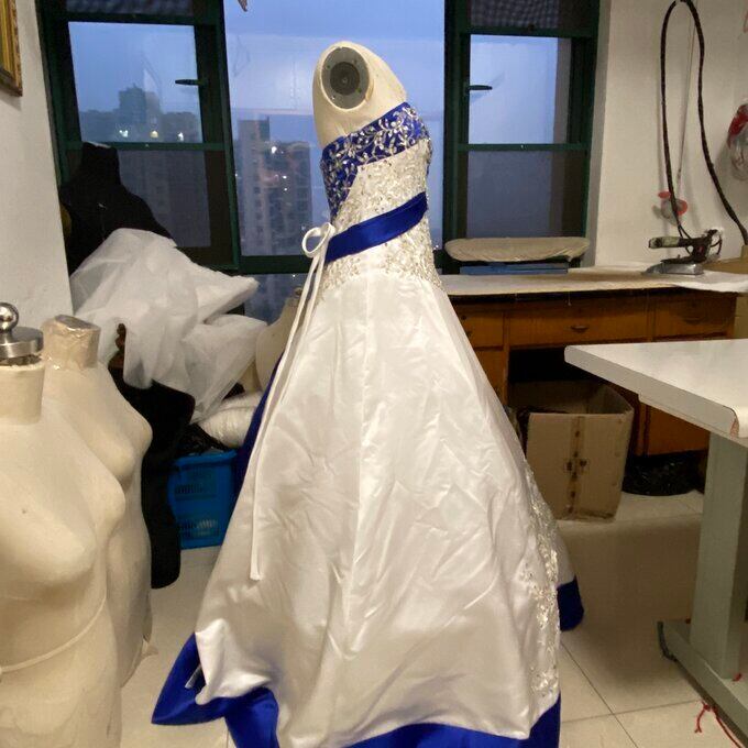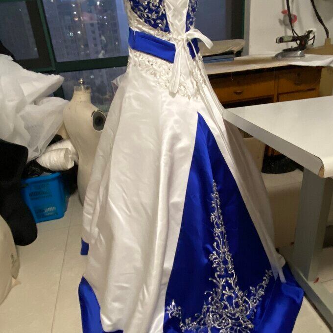 クラシカル ホワイト 青 Aライン ドレス チューブトップ 背中見せ ノースリーブ ロング 繊細レース 拳式