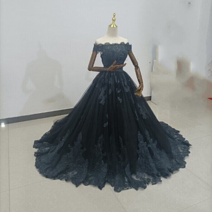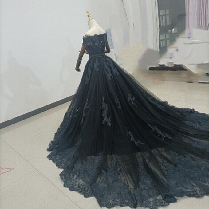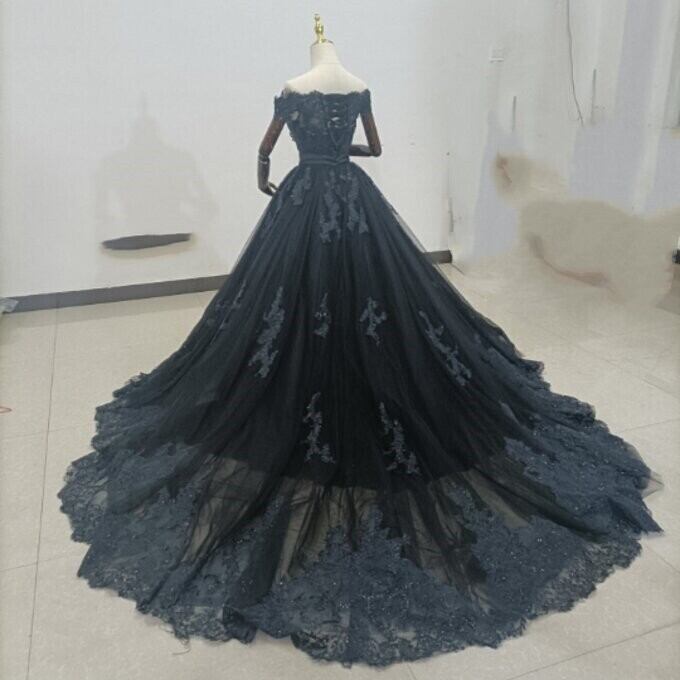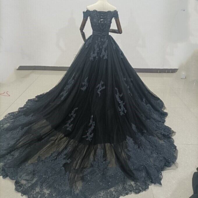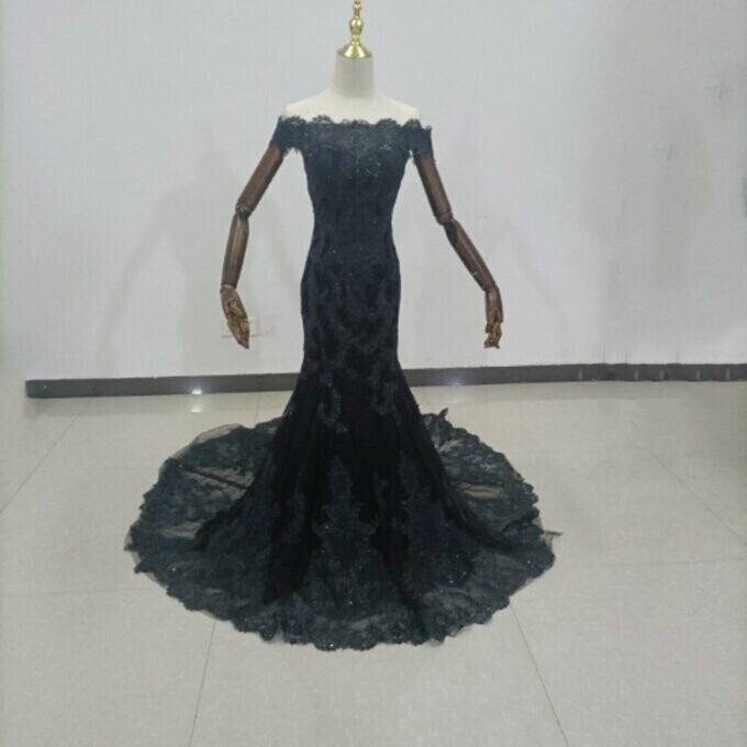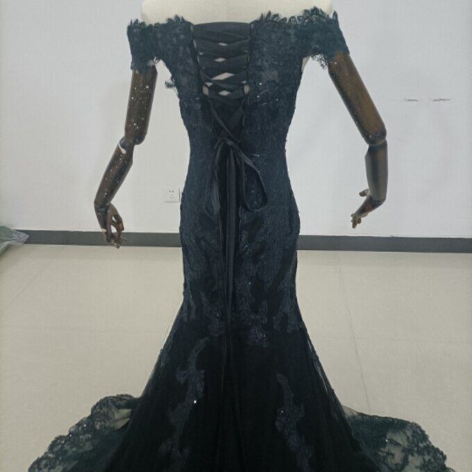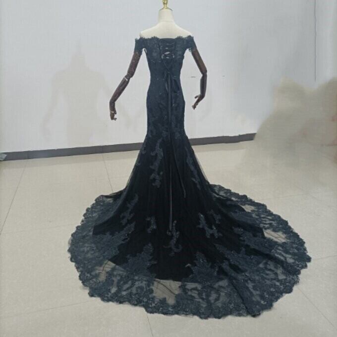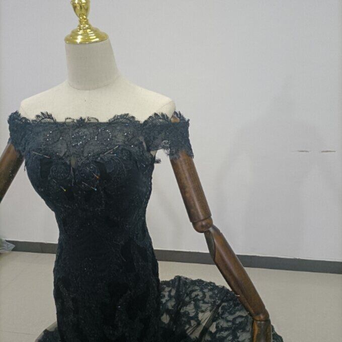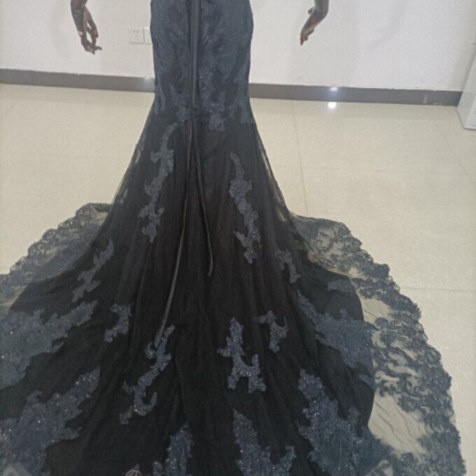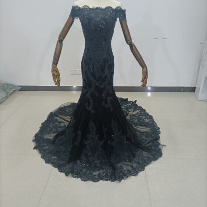上品!黒パーティードレス 贅沢な小花総レース 長袖 マーメイドライン 華やかなトレーン 花嫁/披露宴/ お呼ばれ