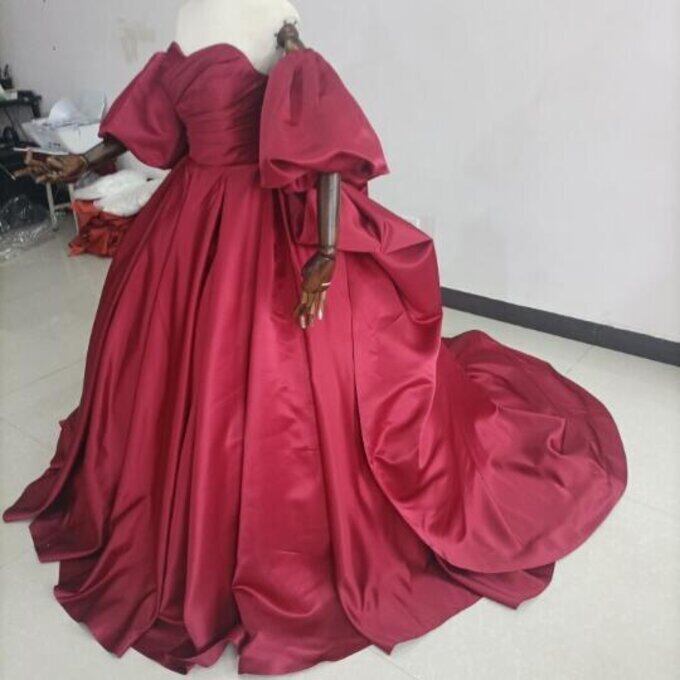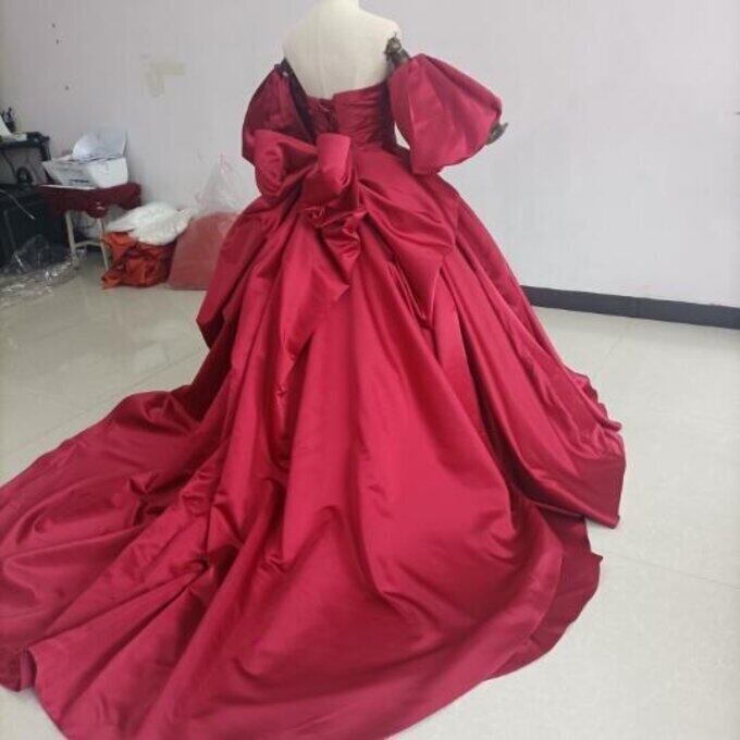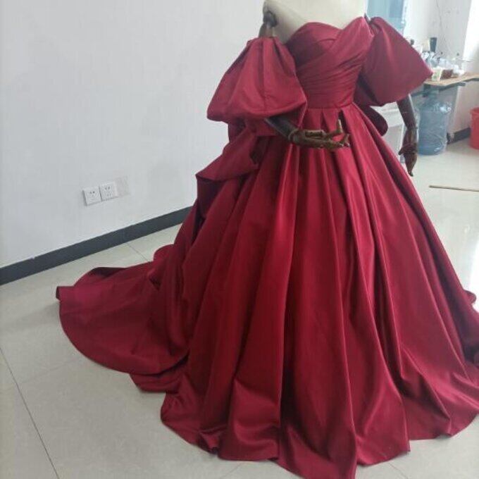 高品質!赤 カラードレス Aライン ベアトップ 取り外し袖 ふっくら柔らかなバックリボン トレーン 花嫁/二次会