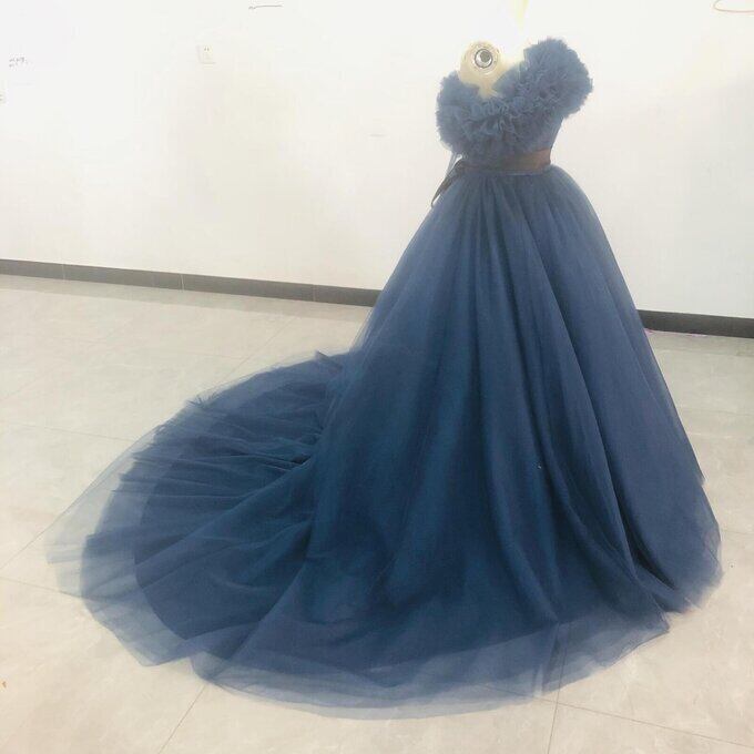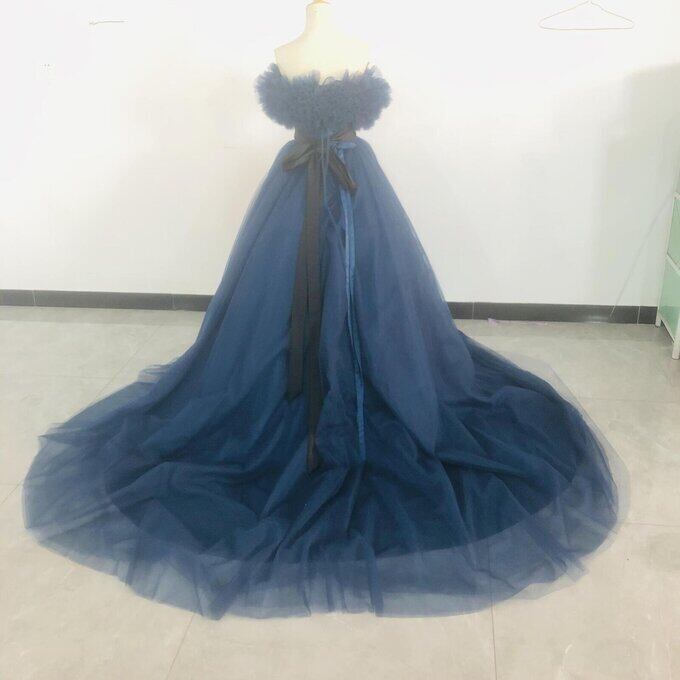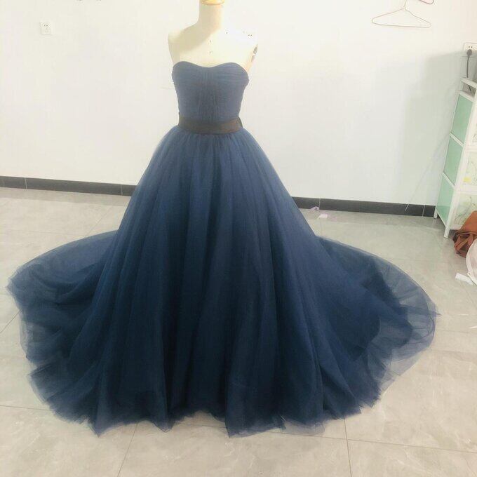 高品質!青 ネイビーブルー カラードレス トレーン 取り外しオフショルダー サッシュベル 挙式 謝恩会 二次会 編み上げ