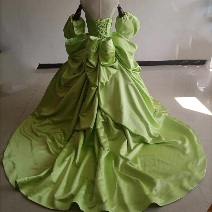 豪華! ライトグリーン カラードレス Aライン 華やかなトレーン 取り外し袖 花嫁/披露宴/二次会