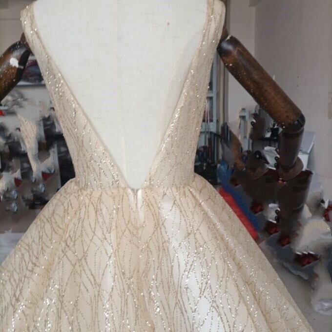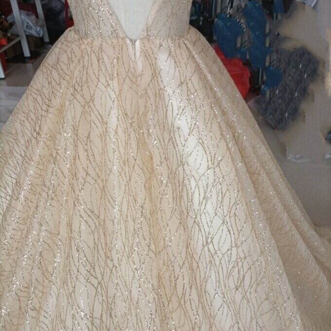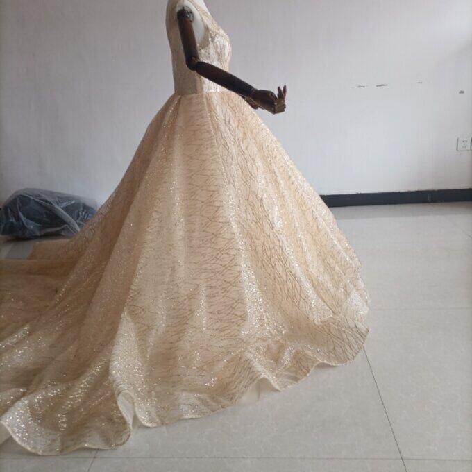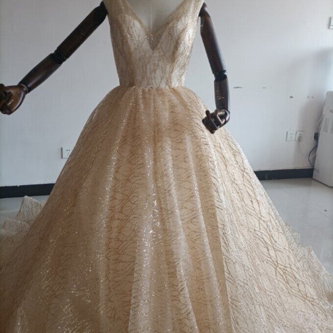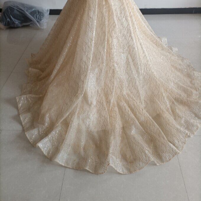 豪華!ゴールド ウエディングドレス キラキラグリッターチュール バックレス 華やかなトレーン 花嫁/前撮