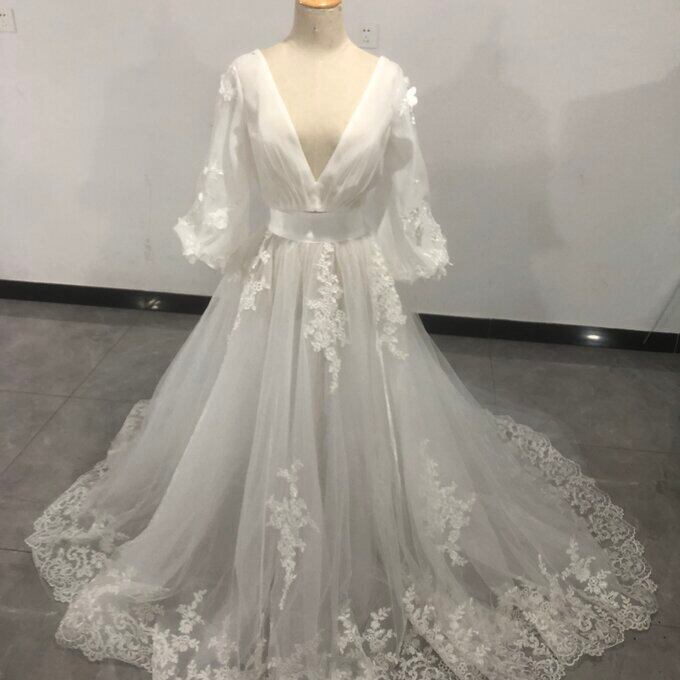 エレガント オフホワイト Vネックドレス ツーピース 背中見せ 華やかなトレーン 結婚式/披露宴/二次会