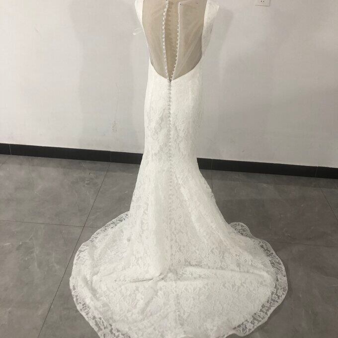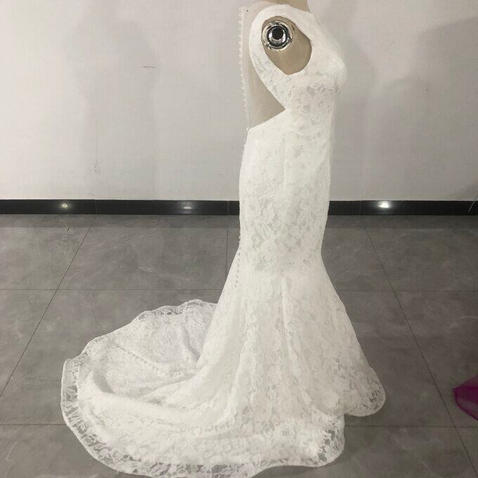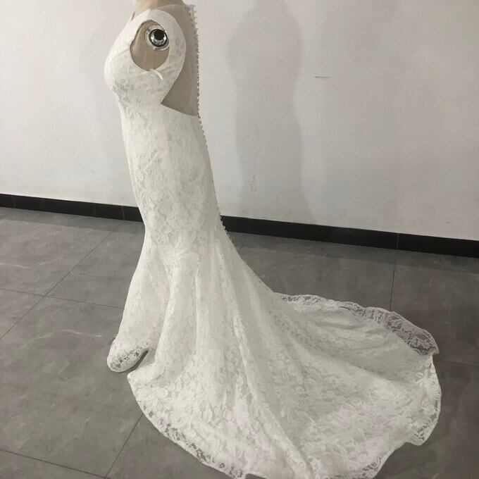 エレガント オフホワイト ウエディングドレス スレンダーライン ミニトレーン マーメイドドレス 総レース 結婚式/披露宴