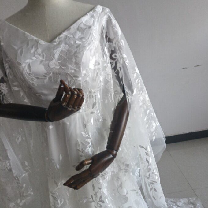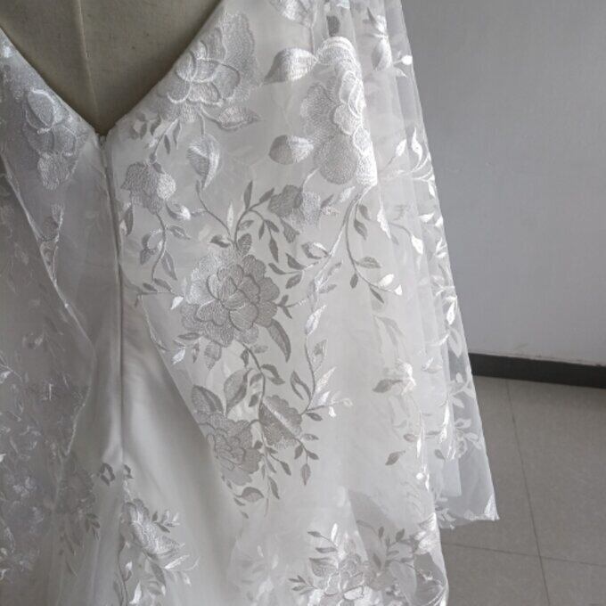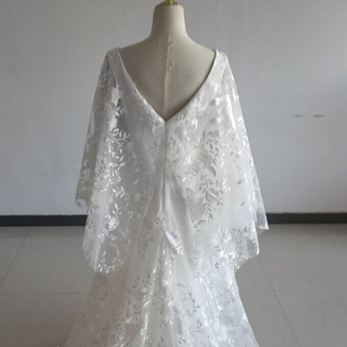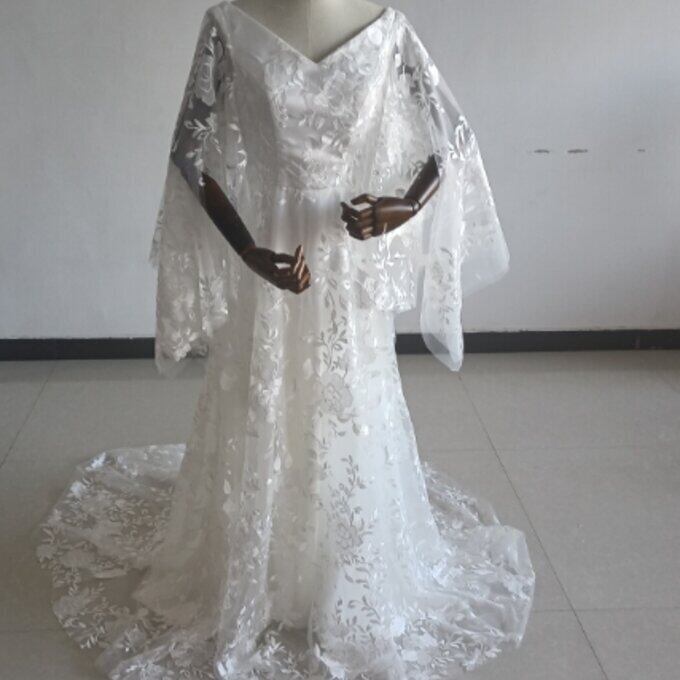 憧れのドレス オフホワイト Vネックドレス 背中見せ 華やかなトレーン ふわふわ袖 結婚式/披露宴/拳式