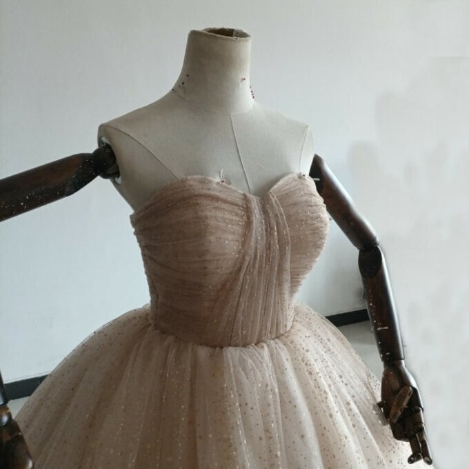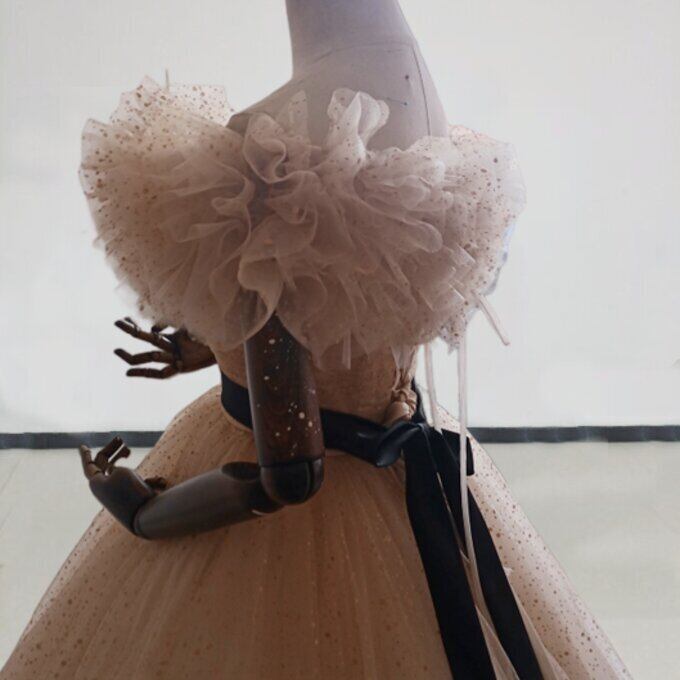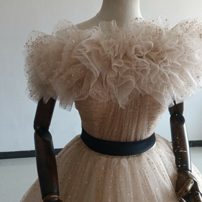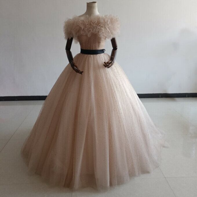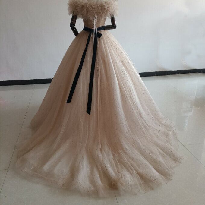 カラードレスシャンパン色 ソフトチュール ロングトレーン 取り外しオフショルダー