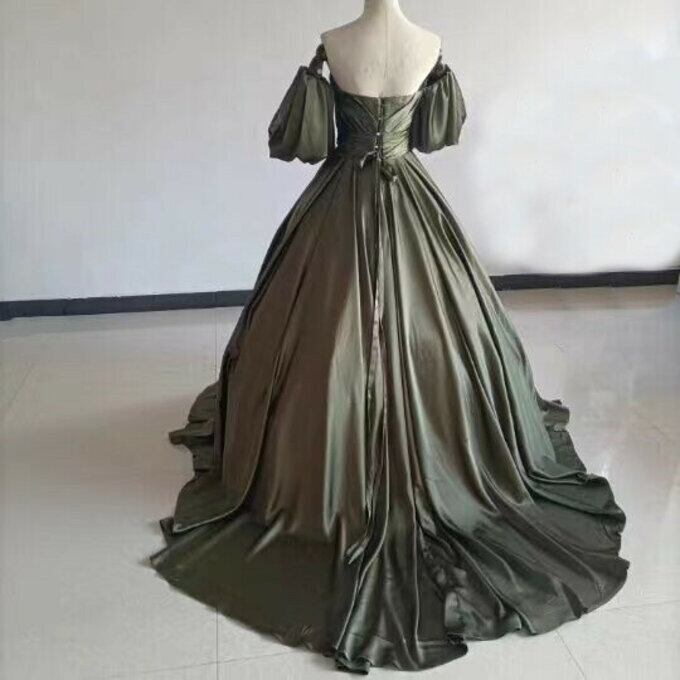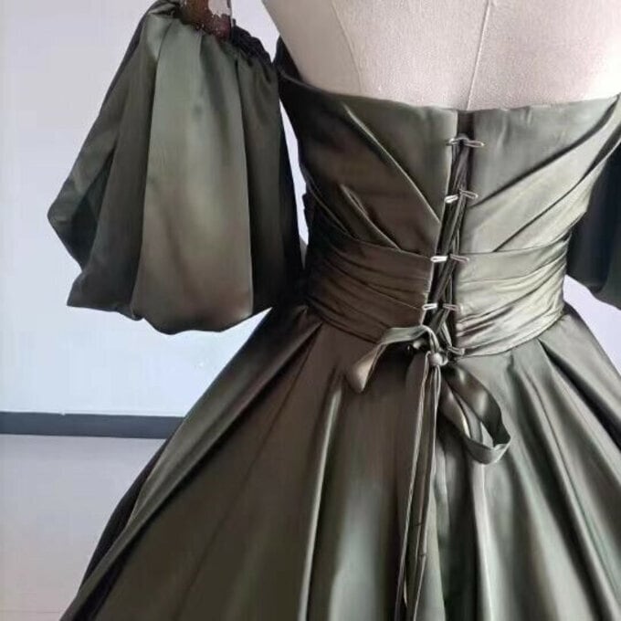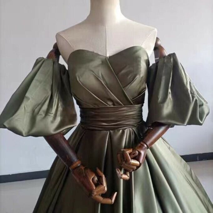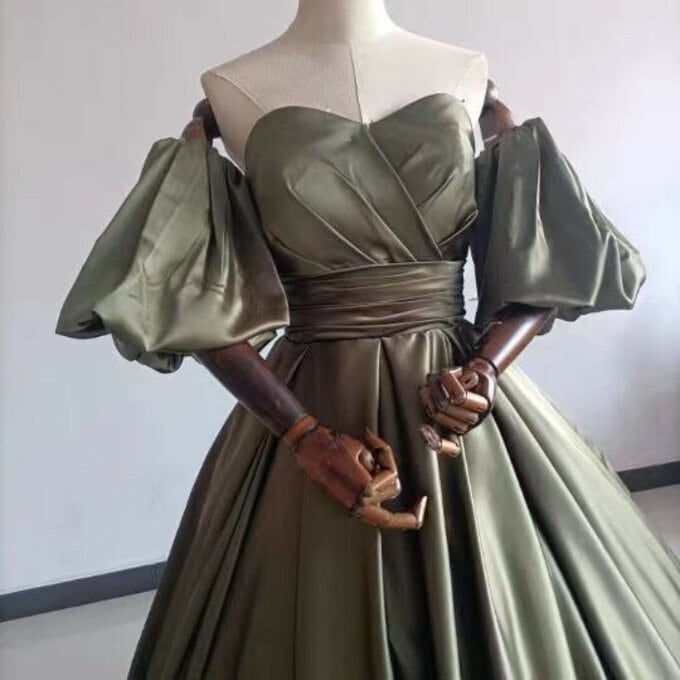 華やか パーティードレス カーキ色 ベアトップ ラッパ袖 ピアノ演奏会/音楽会/発表会など/教会式/人前式