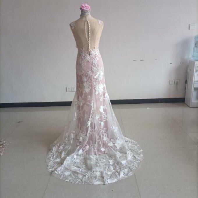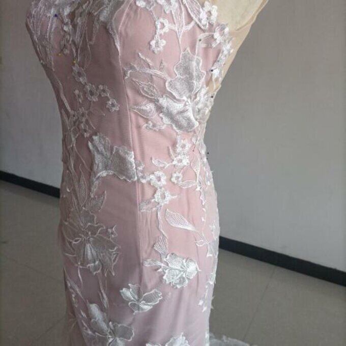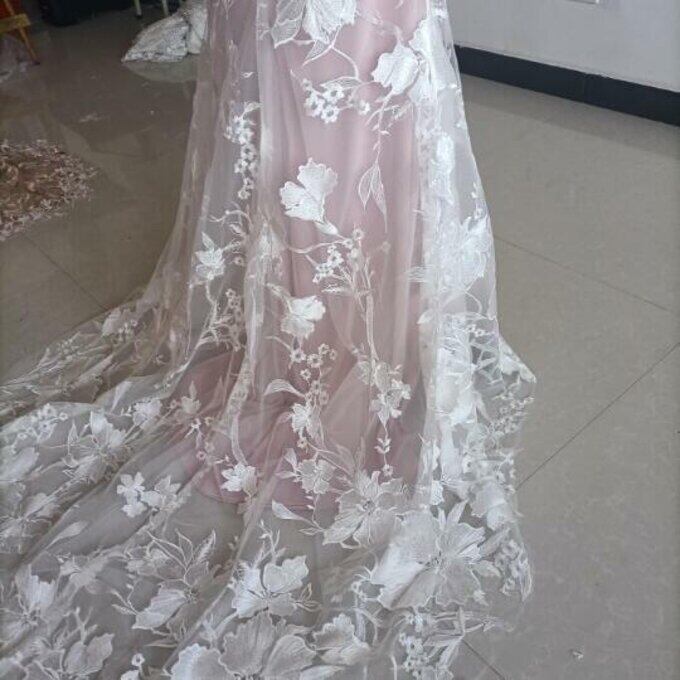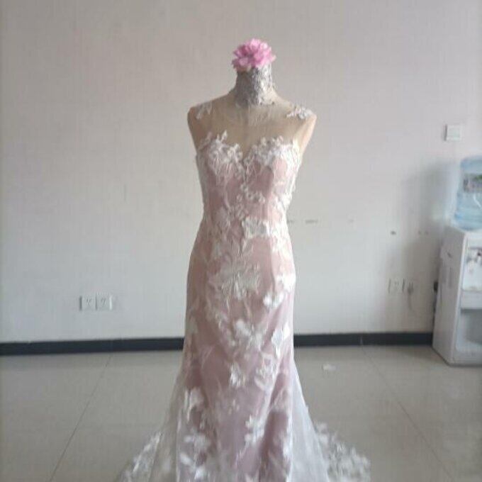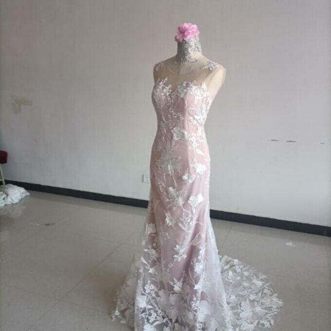 上品!豪華!薄ピンク カラードレス 贅沢な総レース フリルトレーン /結婚式/披露宴/ トレンド人気