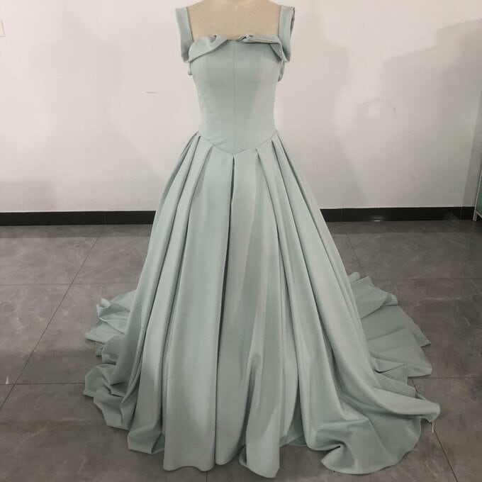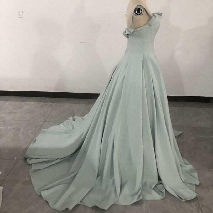 豪華! カラードレス 薄青 光沢サテン 華やかなトレーン ノースリーブ スクエアネック バックレス ファスナー 前撮り