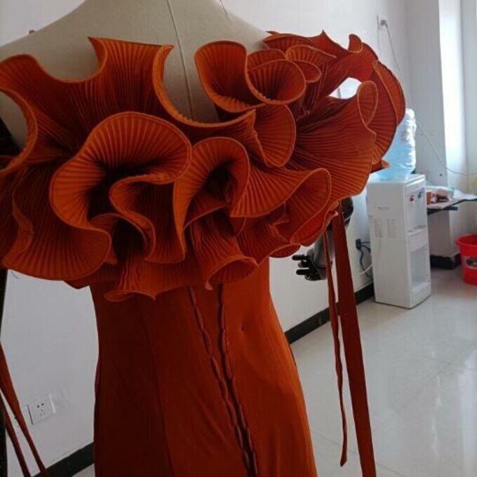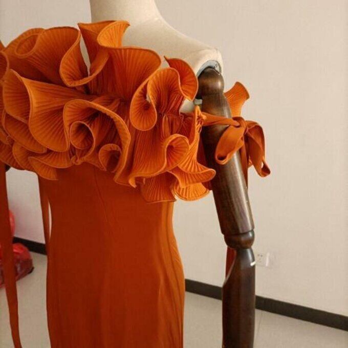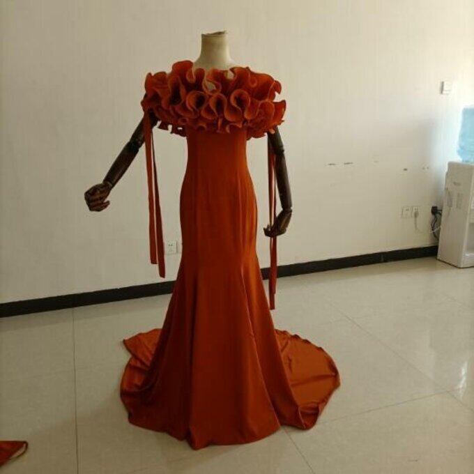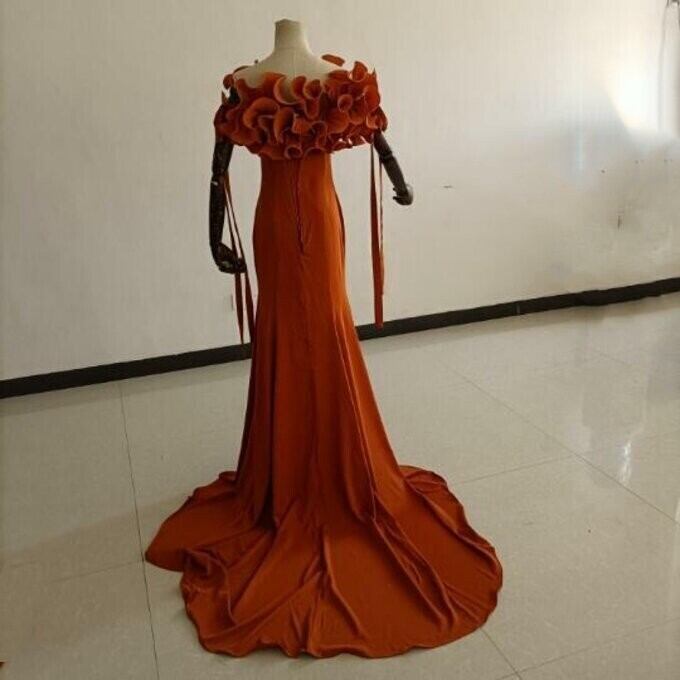 人気上昇!カラードレス テラコッタ色取り外しオフショルダー袖 色直し フリルたっぷり サイズ調整可能、色変更可能 マーメイドライン2次会/挙式/前撮り | David1021k Dress(ダヴィドレス)