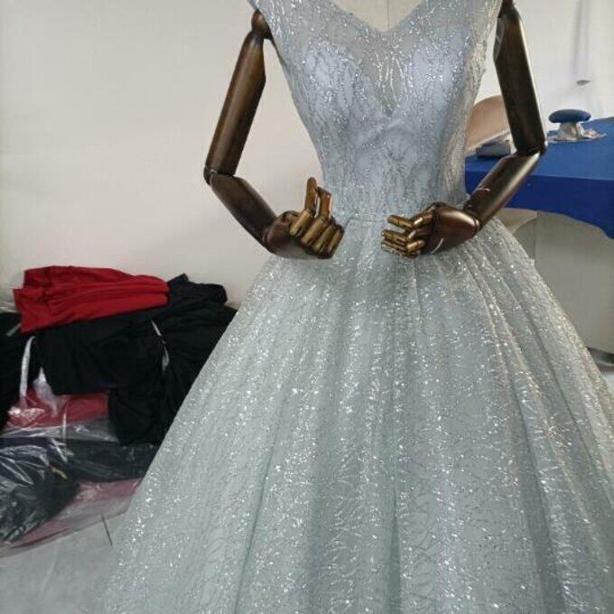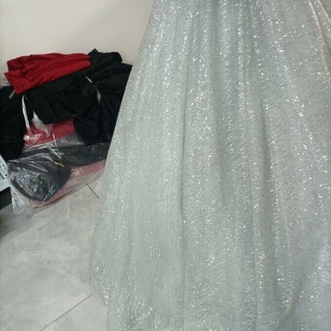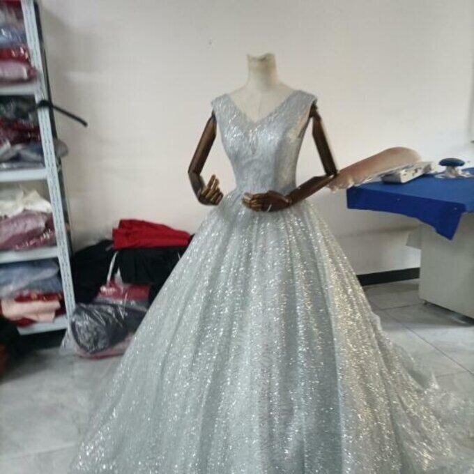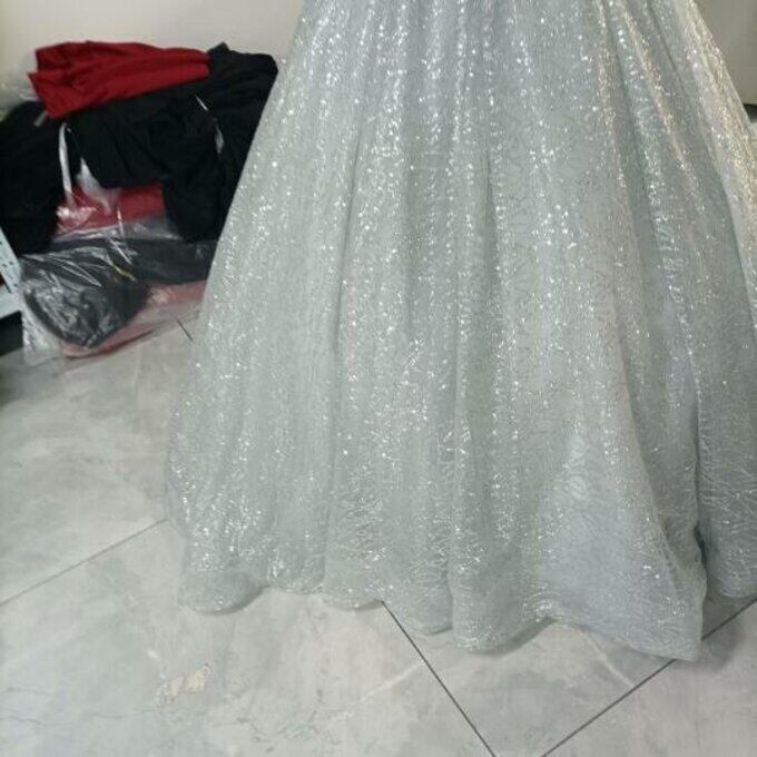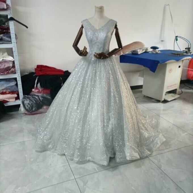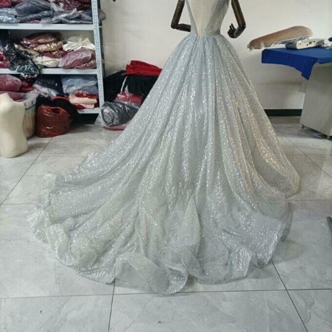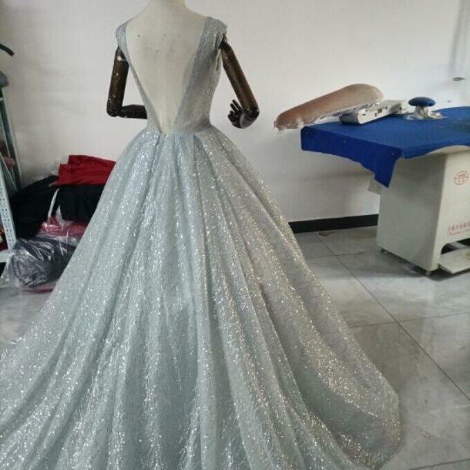 豪華!シルバー ウエディングドレス キラキラグリッターチュール バックレス 華やかなトレーン 花嫁/ブライズメイド/前撮