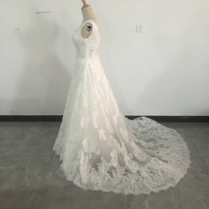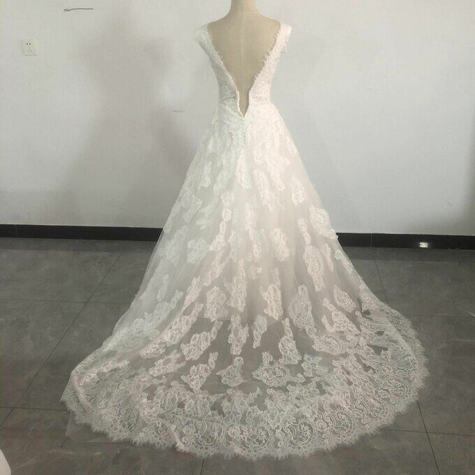 高品質!ウエディングドレス Vネックドレス 咲き誇る透け花レース リボントレーン 花嫁/結婚式/ブライズメイド