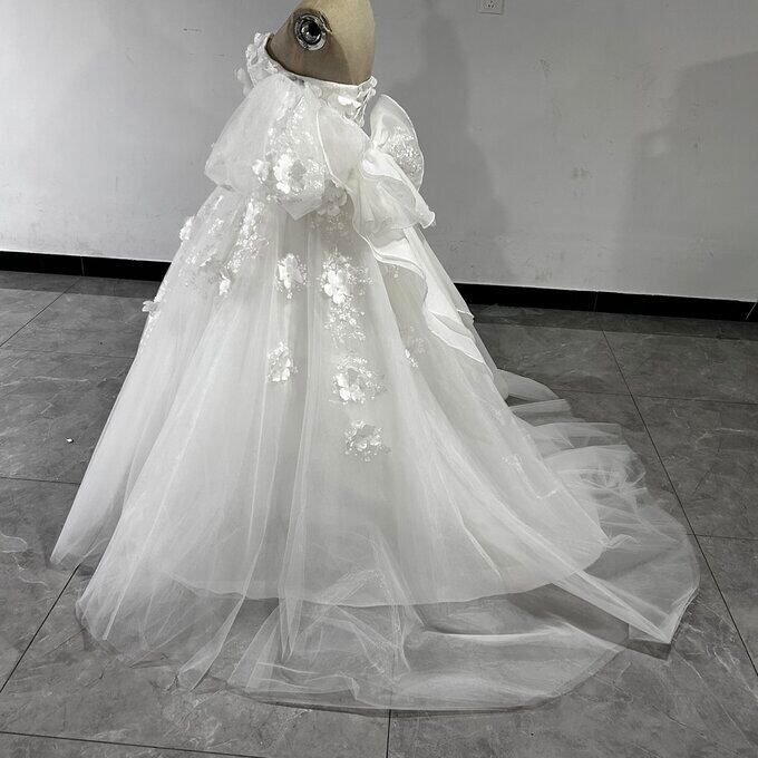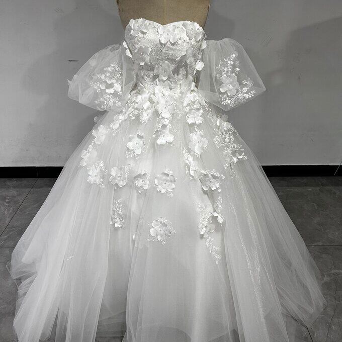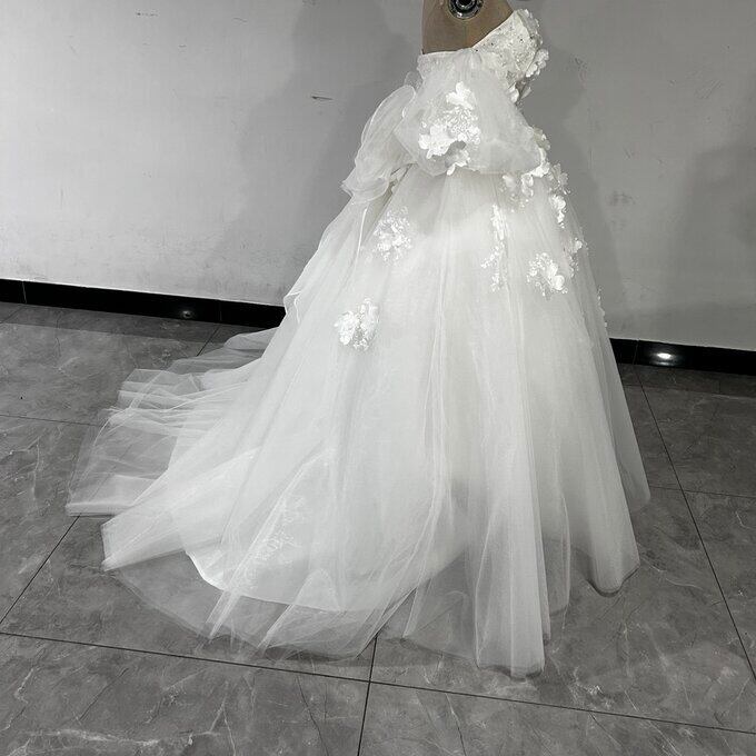 美品!オフホワイト ウエディングドレス ベアトップ 3D立体レース刺繍 花モチーフ 結婚式/披露宴