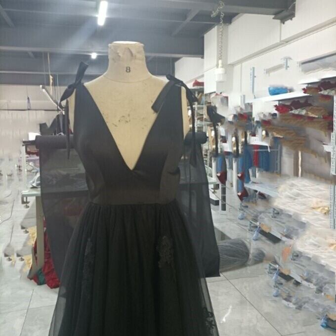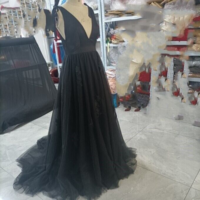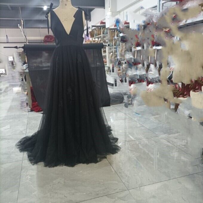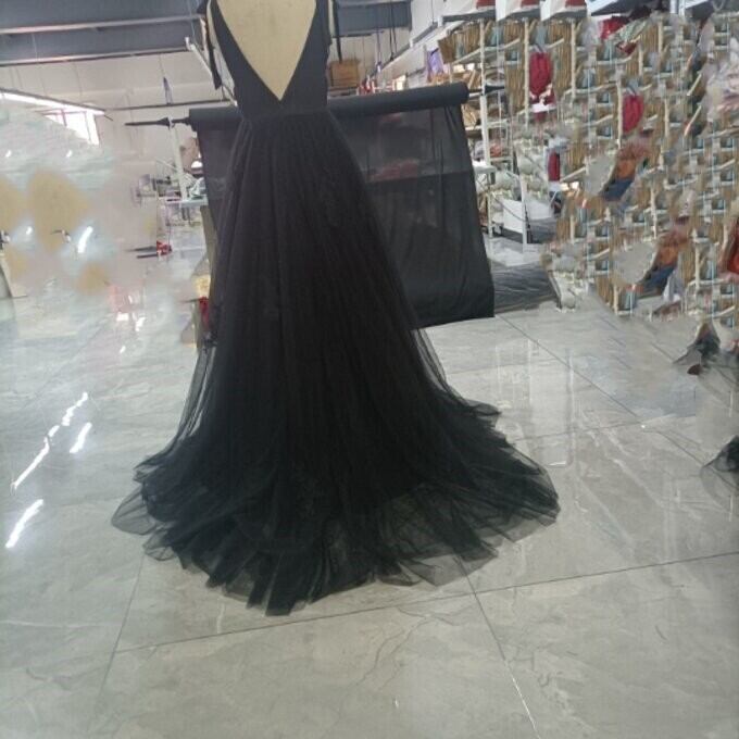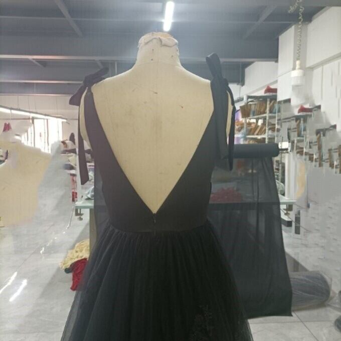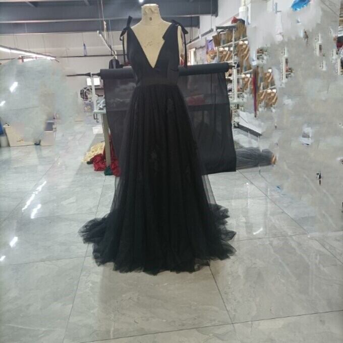 優雅なシルエット黒ソフトチュールVネックドレス背中見せセクシー披露宴/ お呼ばれ/二次会/2次会/合コン