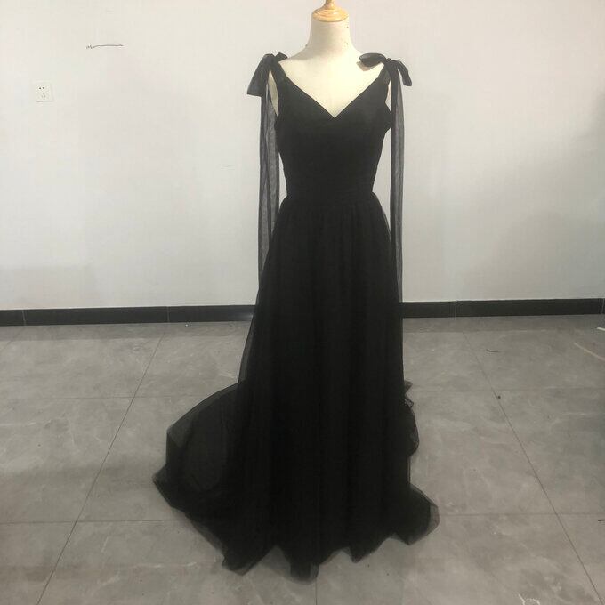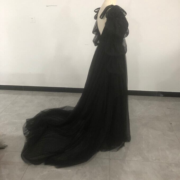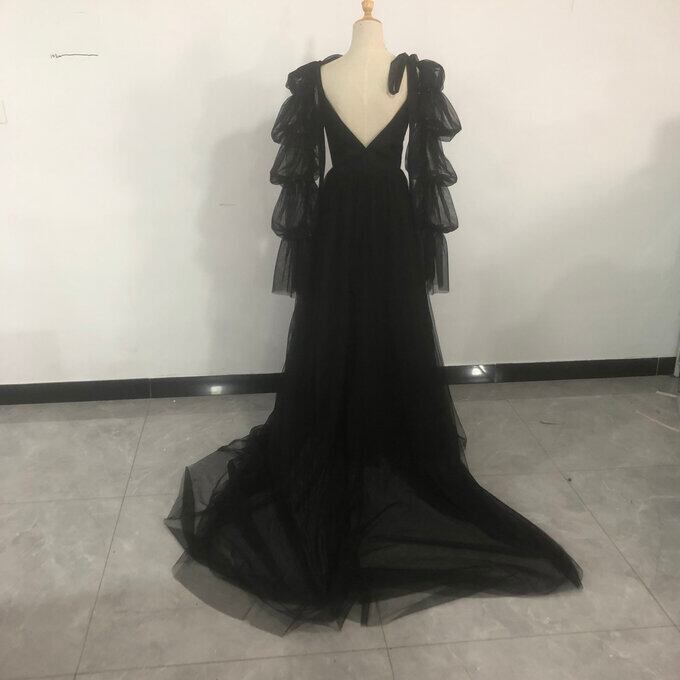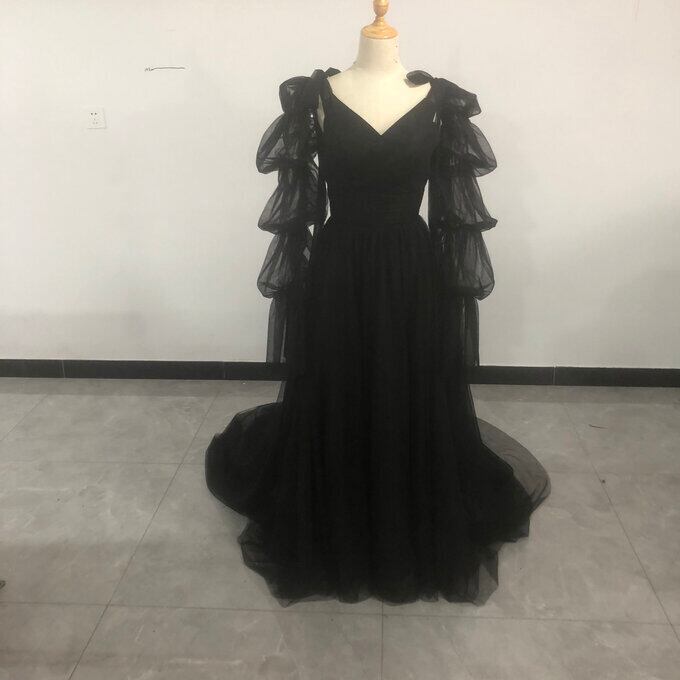 エレガント 黒 上質オーガンジー ロングスリーブ 柔らかく重ねたチュールスカート 披露宴/ お呼ばれ/二次会/2次会