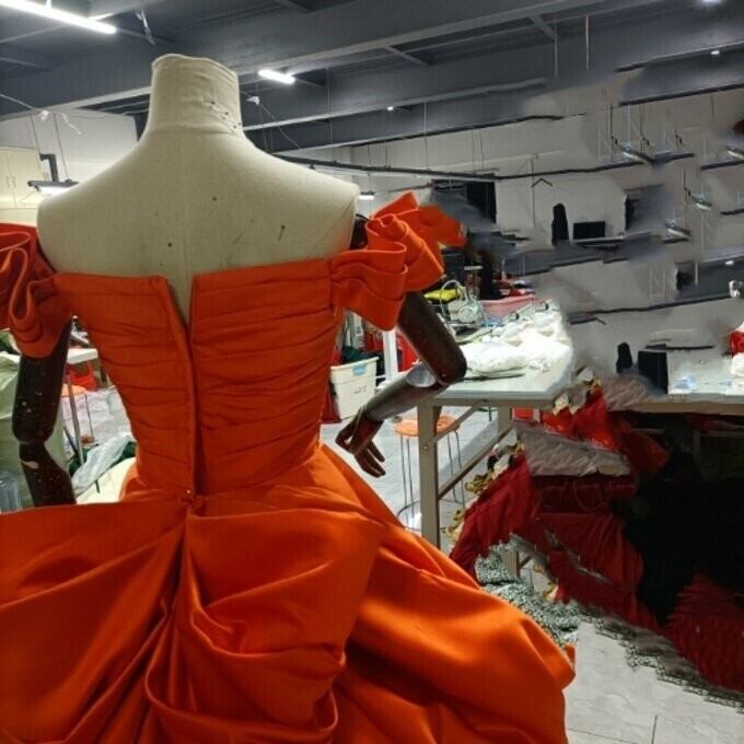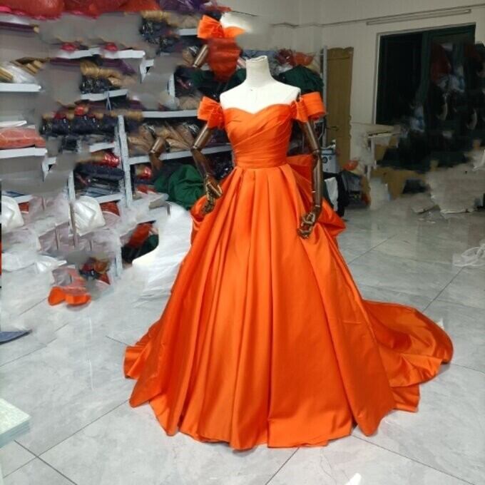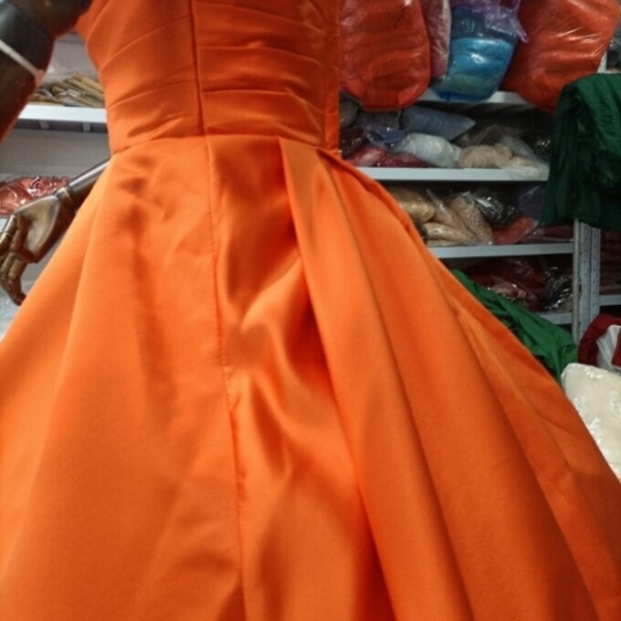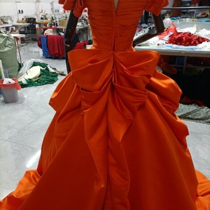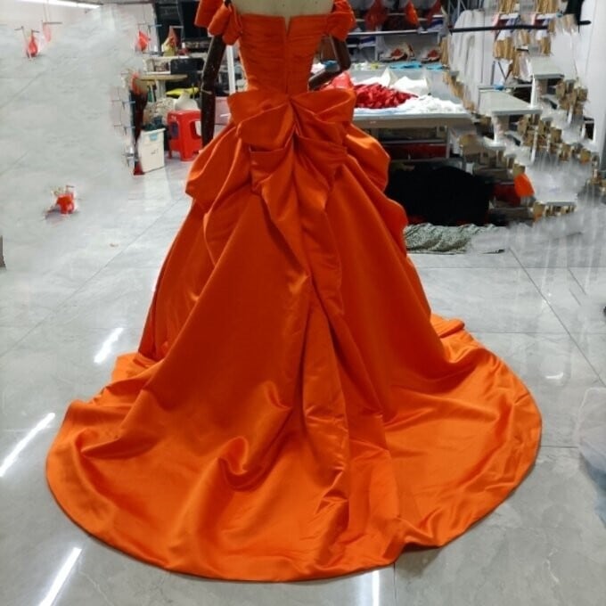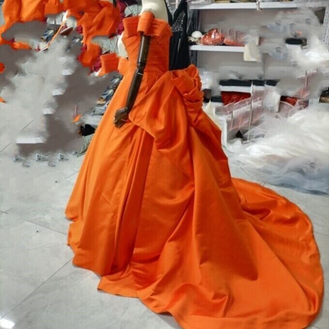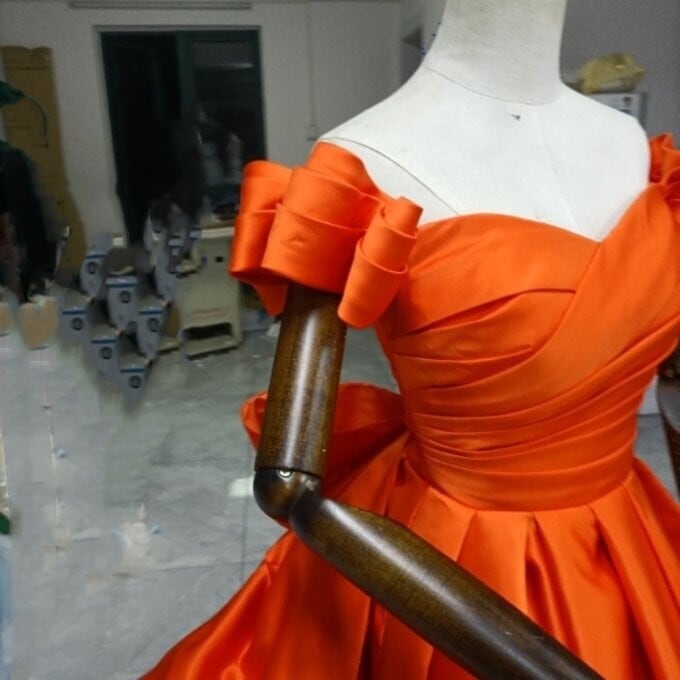 クラシカル 高品質!オレンジ高級イタリアサテンパーティードレス フリル袖 結婚式/披露宴/ お呼ばれ/二次会/2次会