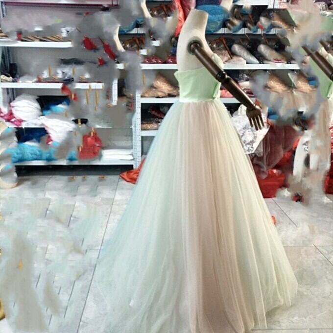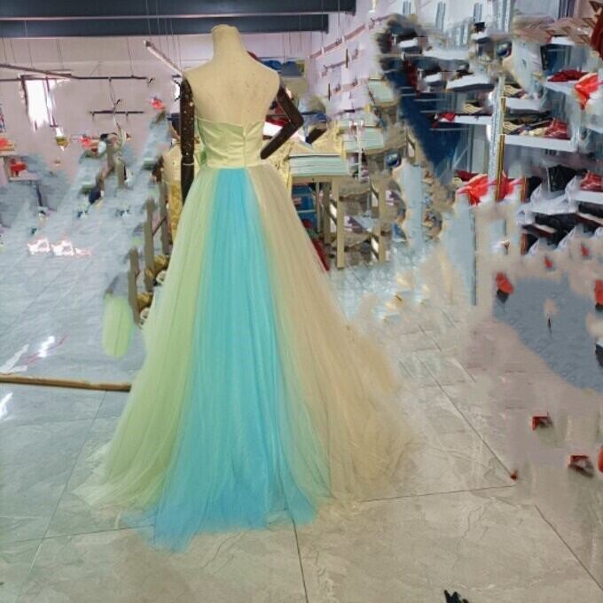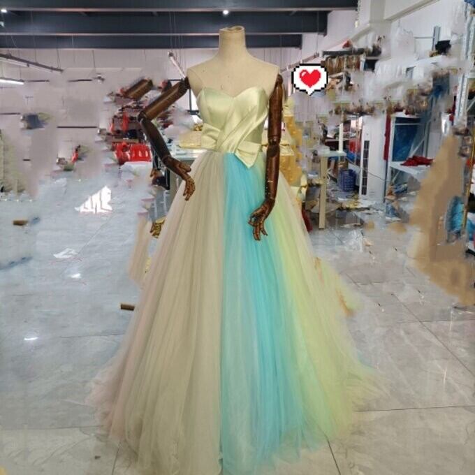 美品!カラードレス レインボー ロング ベアトップ リボン プリンセスライン 細見えシルエット