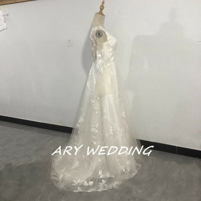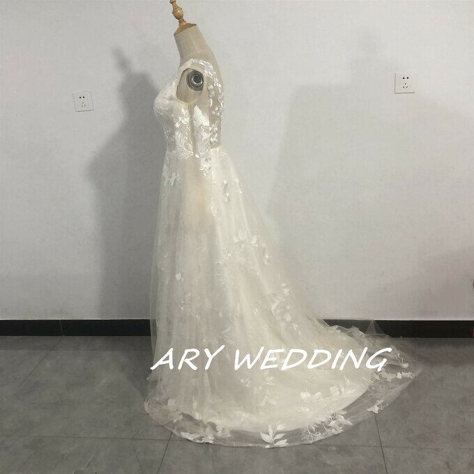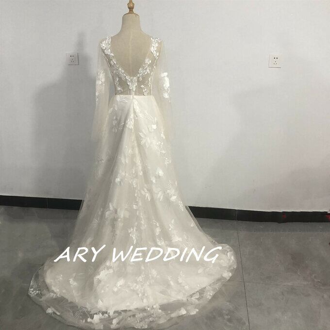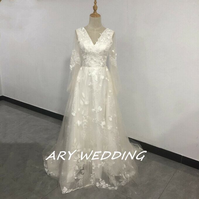 高品質!Vネックドレスレースウエディングドレス 薄シャンパンの色 姫袖 プリンセスライン