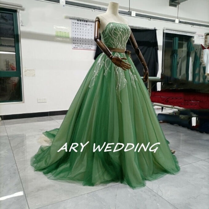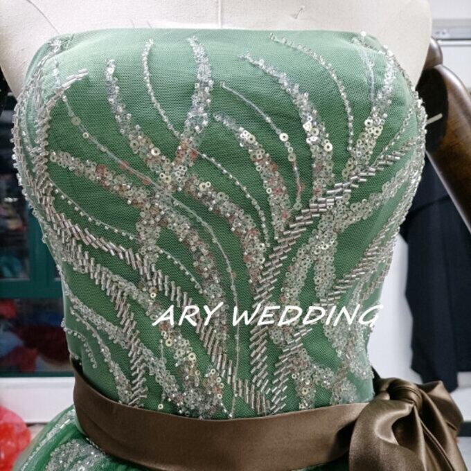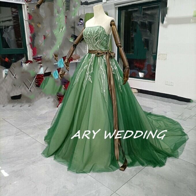 カラードレス 緑 ベアトップ 華やかなトレーン 2次会/挙式 /謝恩会 エレガント 憧れのドレス
