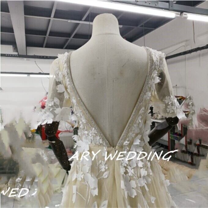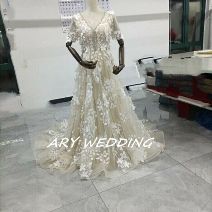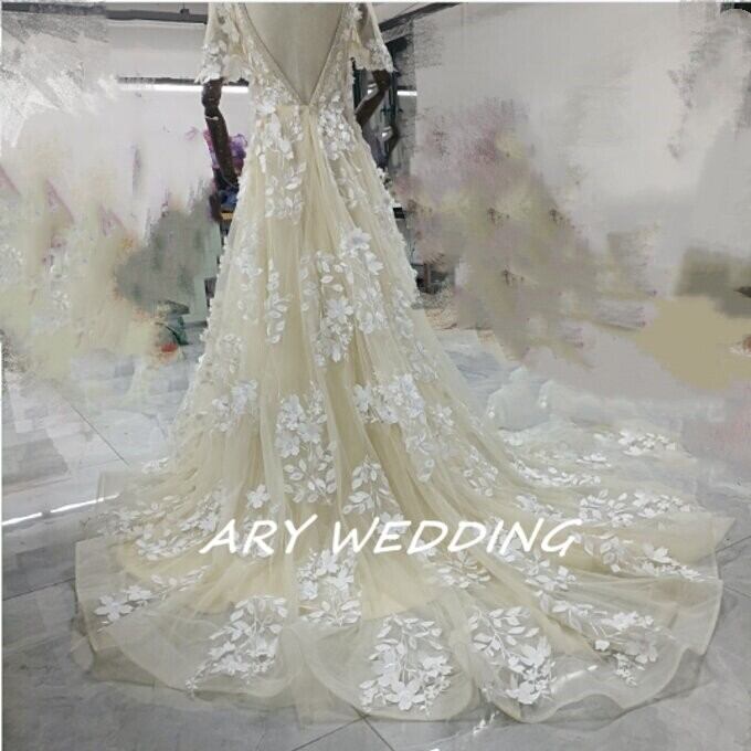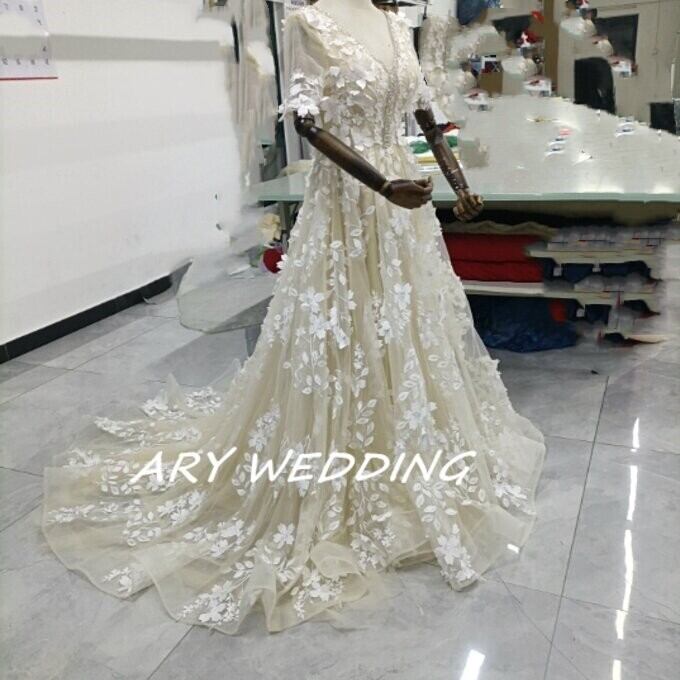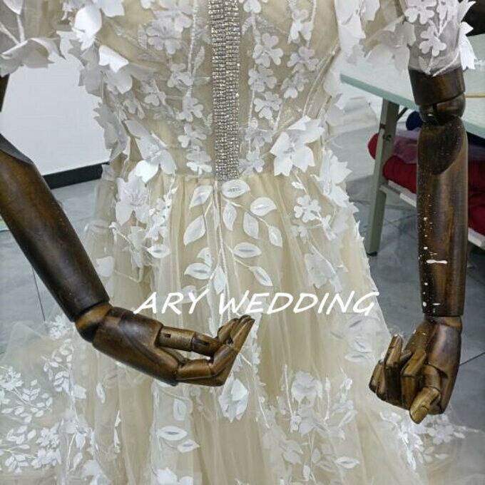 リーフ刺繍 3D立体レース刺繍 ウェディングドレス Vネックドレス 披露宴/挙式