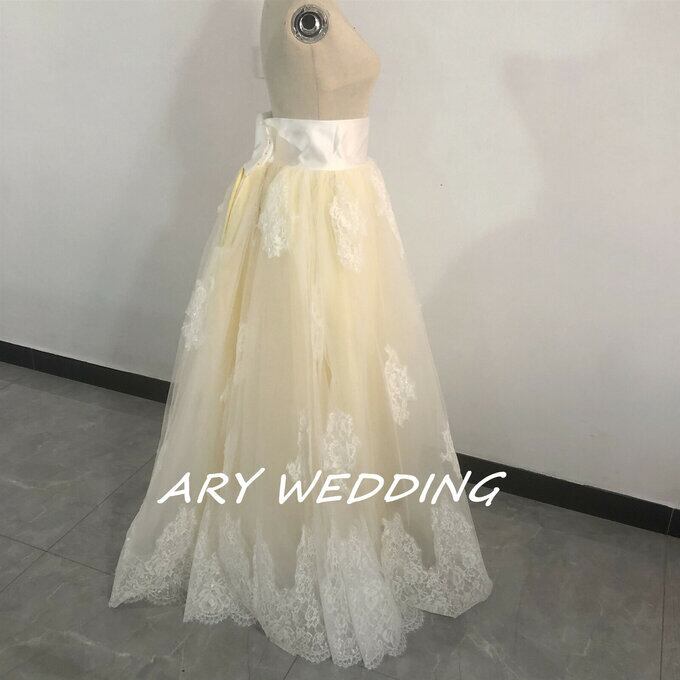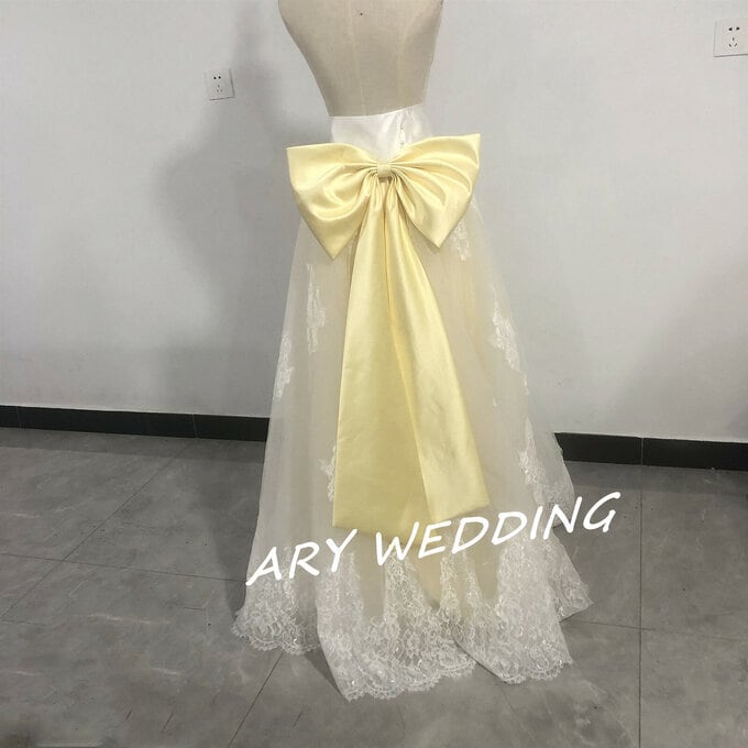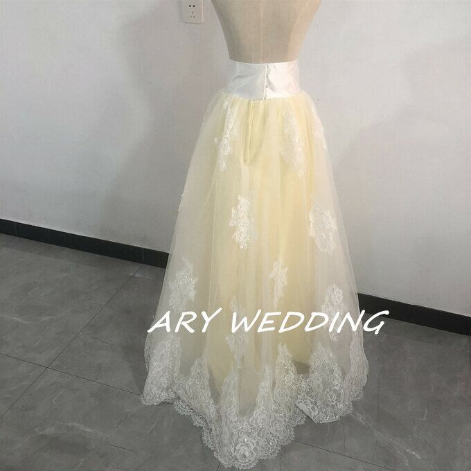 美しい花レース サテン生地にチュールが四層 パステルイエローオーバースカート ウエディングドレス お色直し
