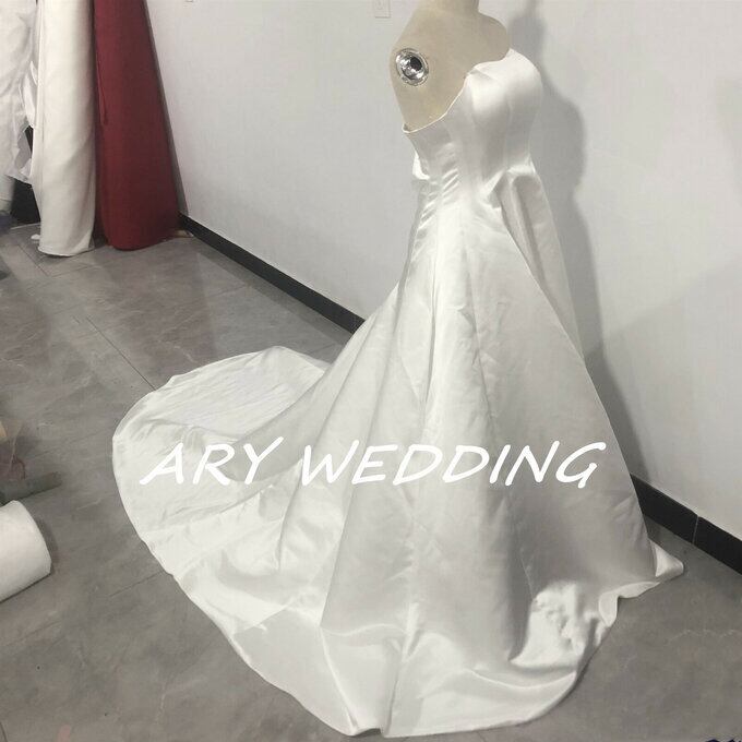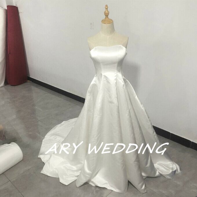 フランス風 ベアトップ ウエディングドレス 光沢サテン 華やかなトレーン 憧れのドレス