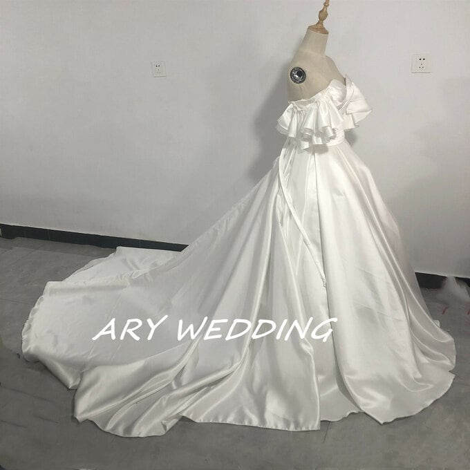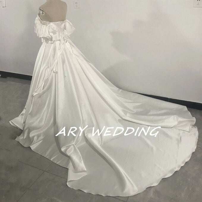 豪華!オフショル ウエディングドレス 光沢サテン 華やかなトレーン プリンセスライン 憧れのドレス