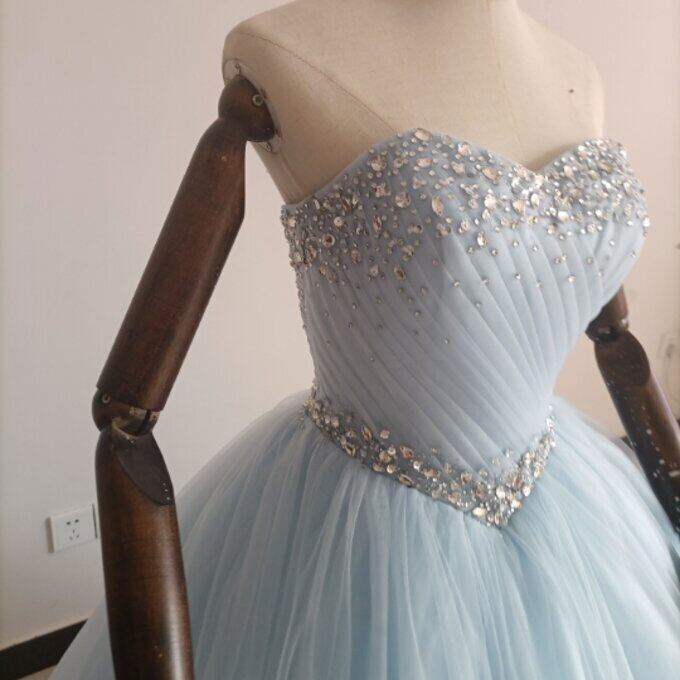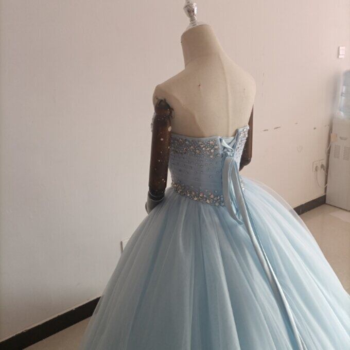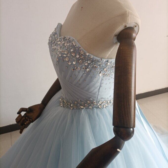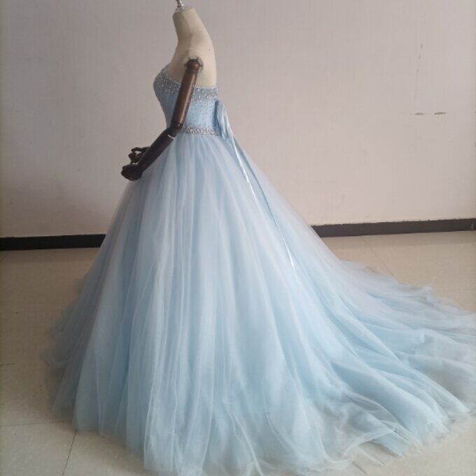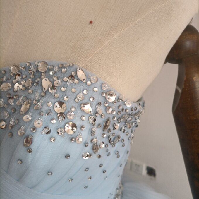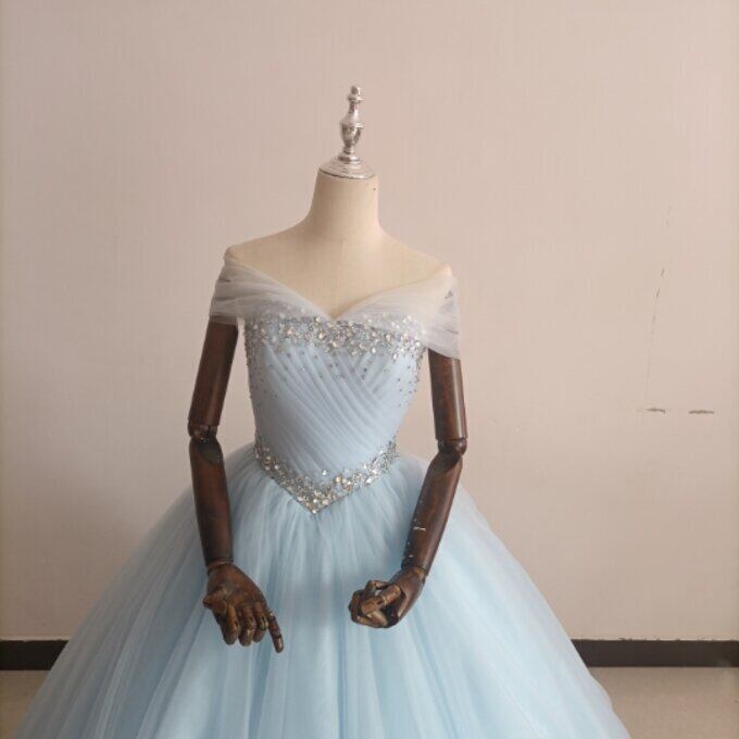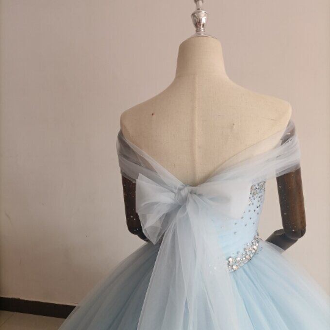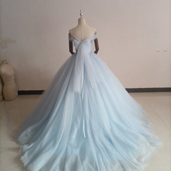 美品!憧れのドレス 薄青 ソフトチュール ビジュー 取り外しオフショルダー 結婚式/披露宴