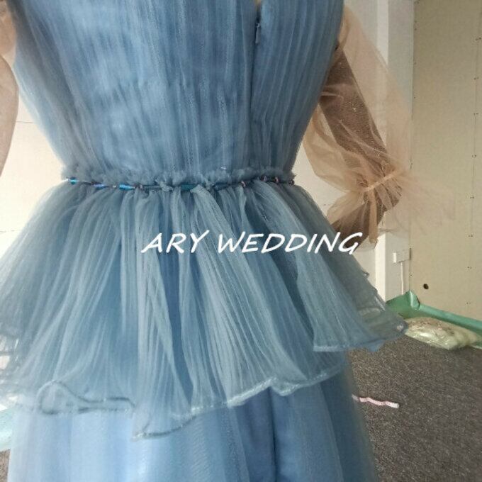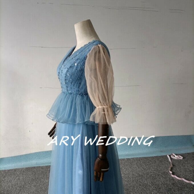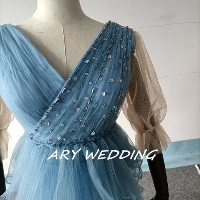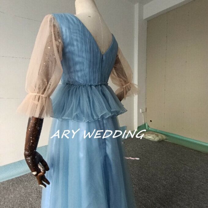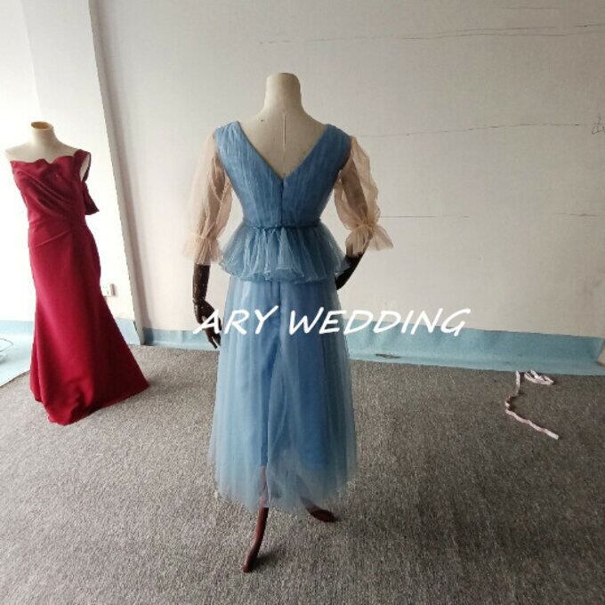 人気上昇 パーティードレス ブルーグレー ソフトチュール 可愛い 2次会 ミディアムドレス
