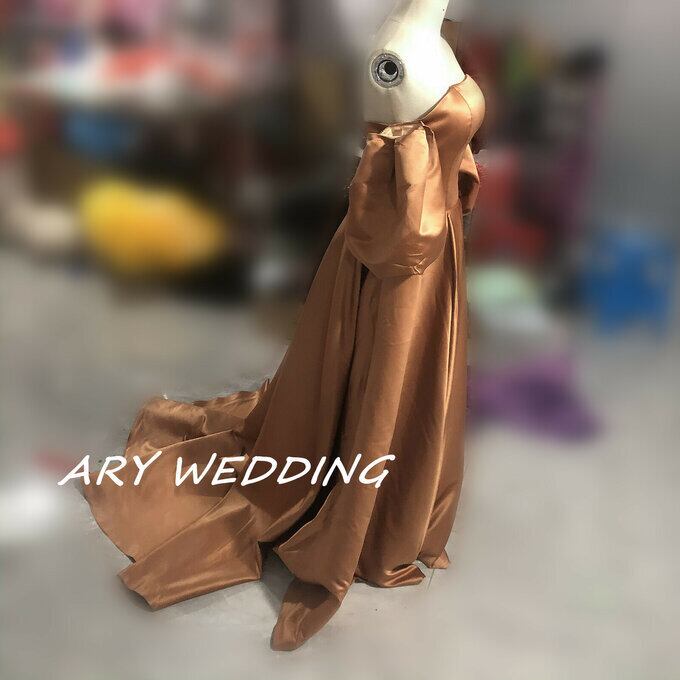 人気上昇 光沢サテン オフショル パーティードレス カーキ色 ロングトレーン 二次会 挙式 前撮り 憧れのドレス