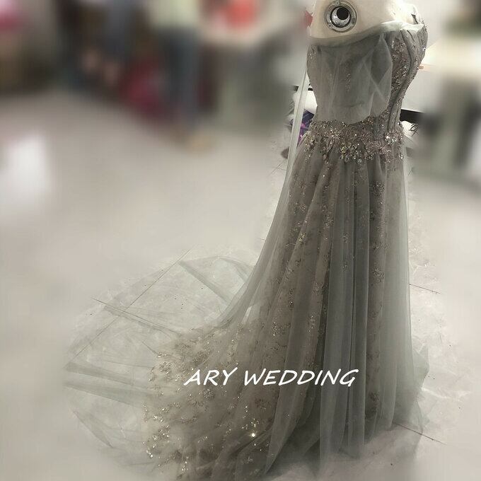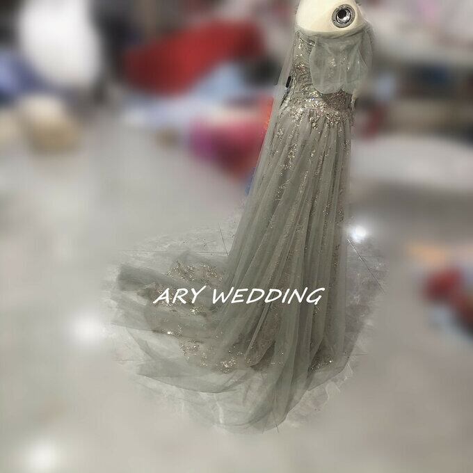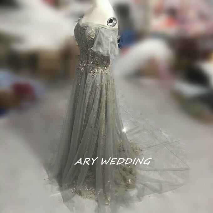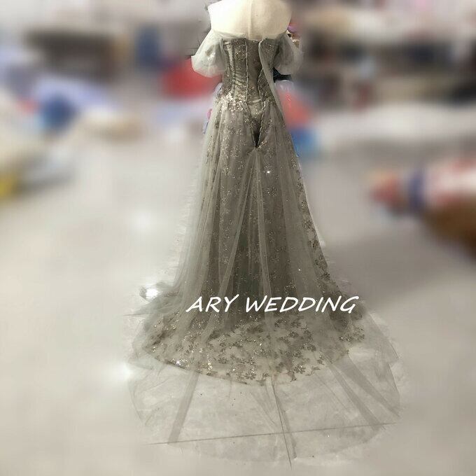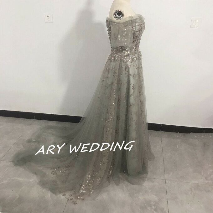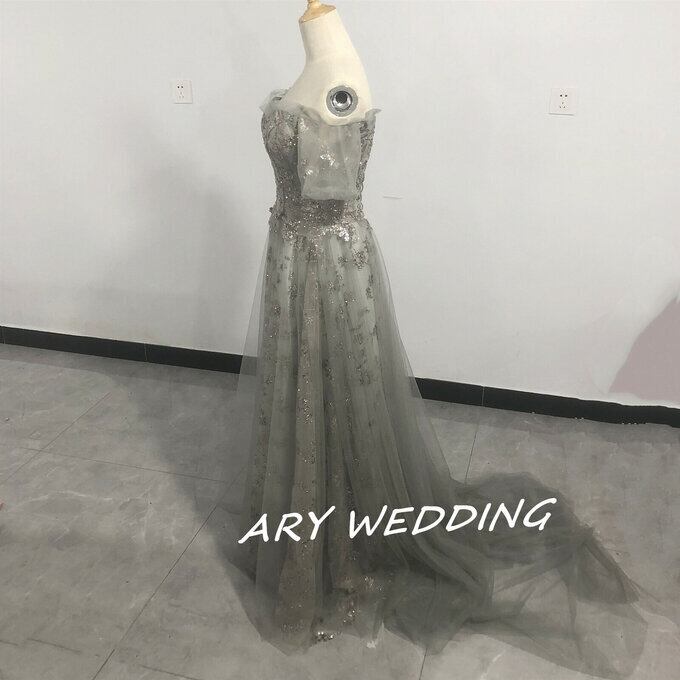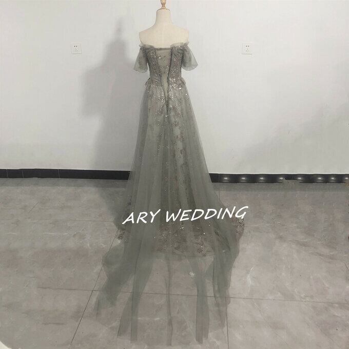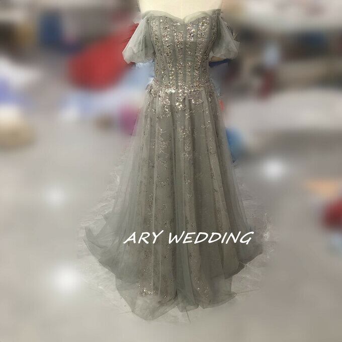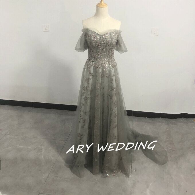 大人気上昇 パーティードレス 薄グレー オフショル スパンコール 短トレーン 2次会/合コン ロングドレス