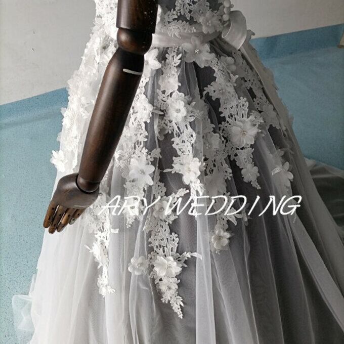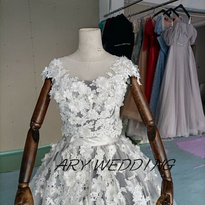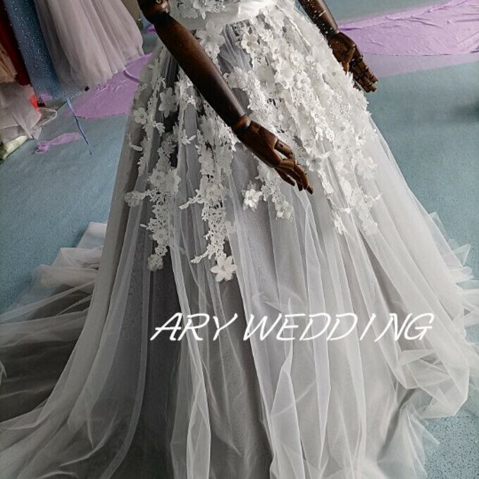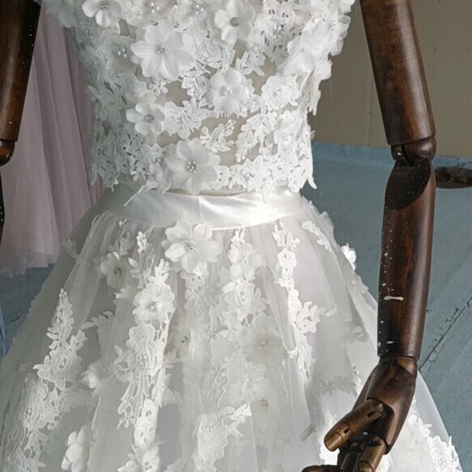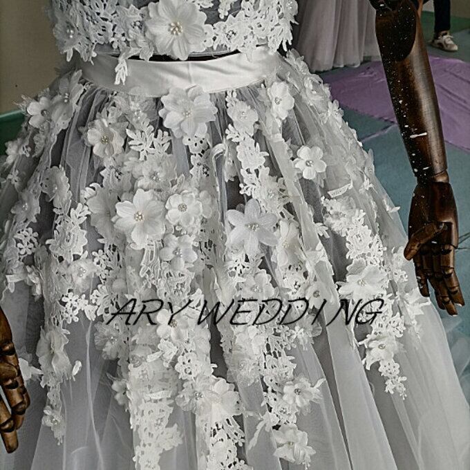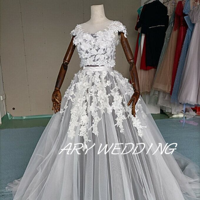 高品質! ウエディングドレス ボレロ+オーバースカート 一体感2点セット 袖なし パール 立体感お花