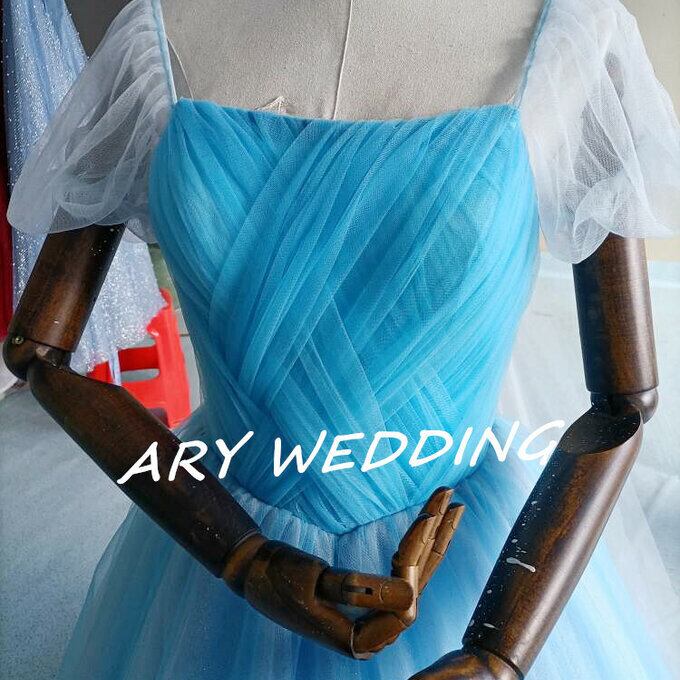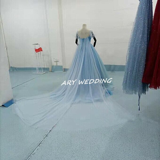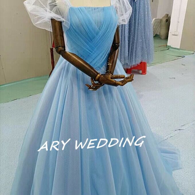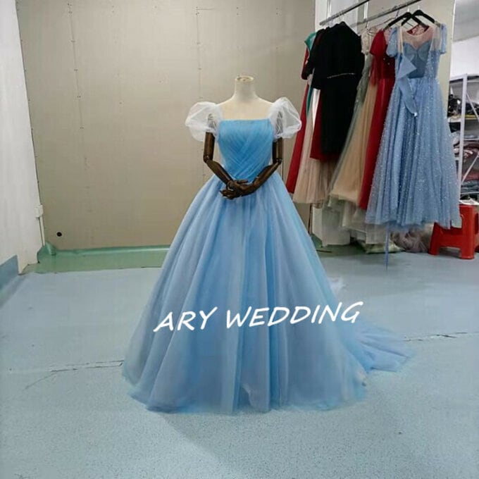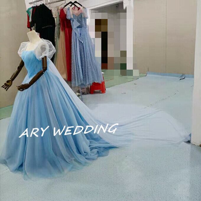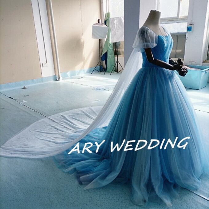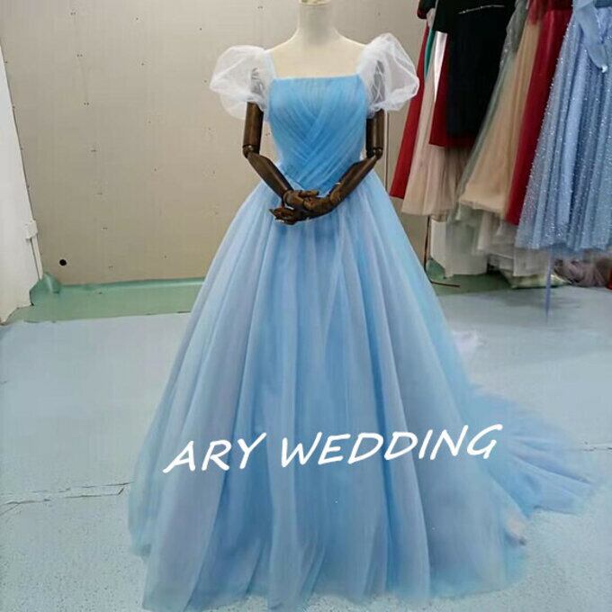 高品質!ラウンドネック カラードレス 水色 プリンセスライン パフスリーブ 花嫁/ウェディン グラデーション