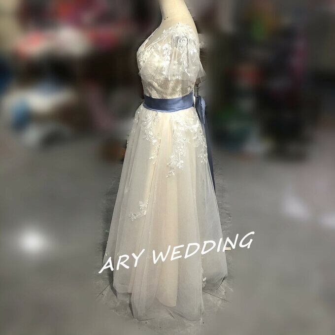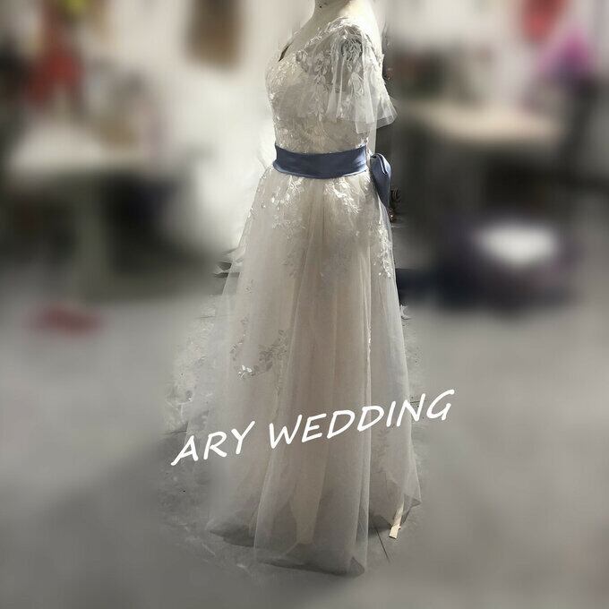 フランス風 ウエディングドレス Vネックドレス 薄シャンパンの色 取り外し可能 リボン 可愛 憧れのドレス