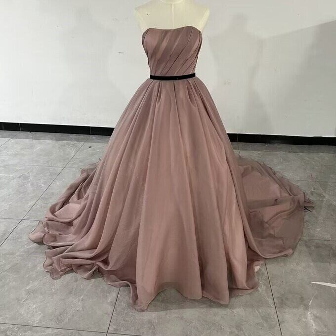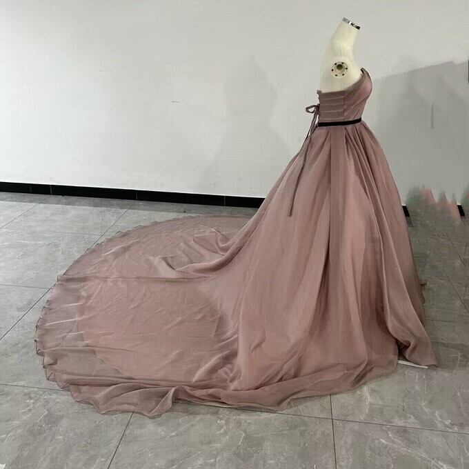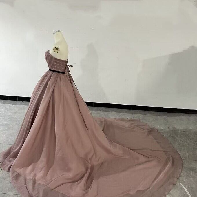 あんず色カラードレス 結婚式ドレス ベアトップ トレーン 花嫁 前撮り 編み上げ