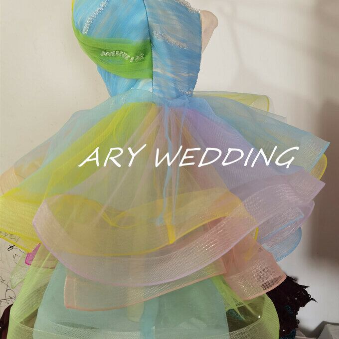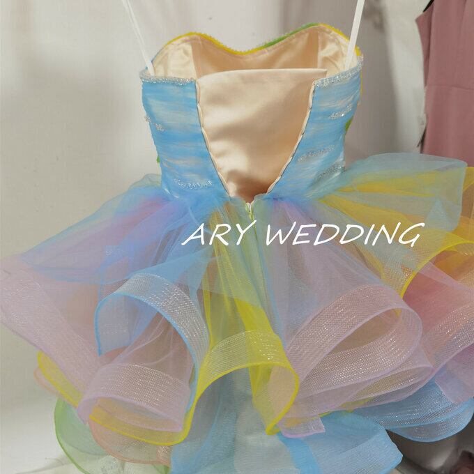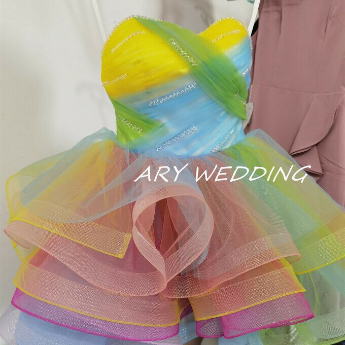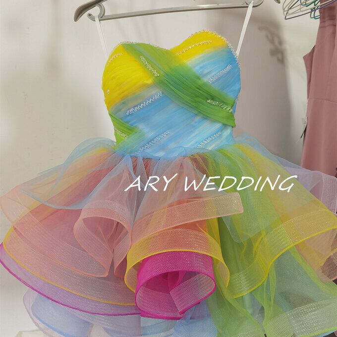 高品質!レインボー カラードレス 虹色 ミニドレス お呼ばれ/2次会 謝恩会/ ショートインロング